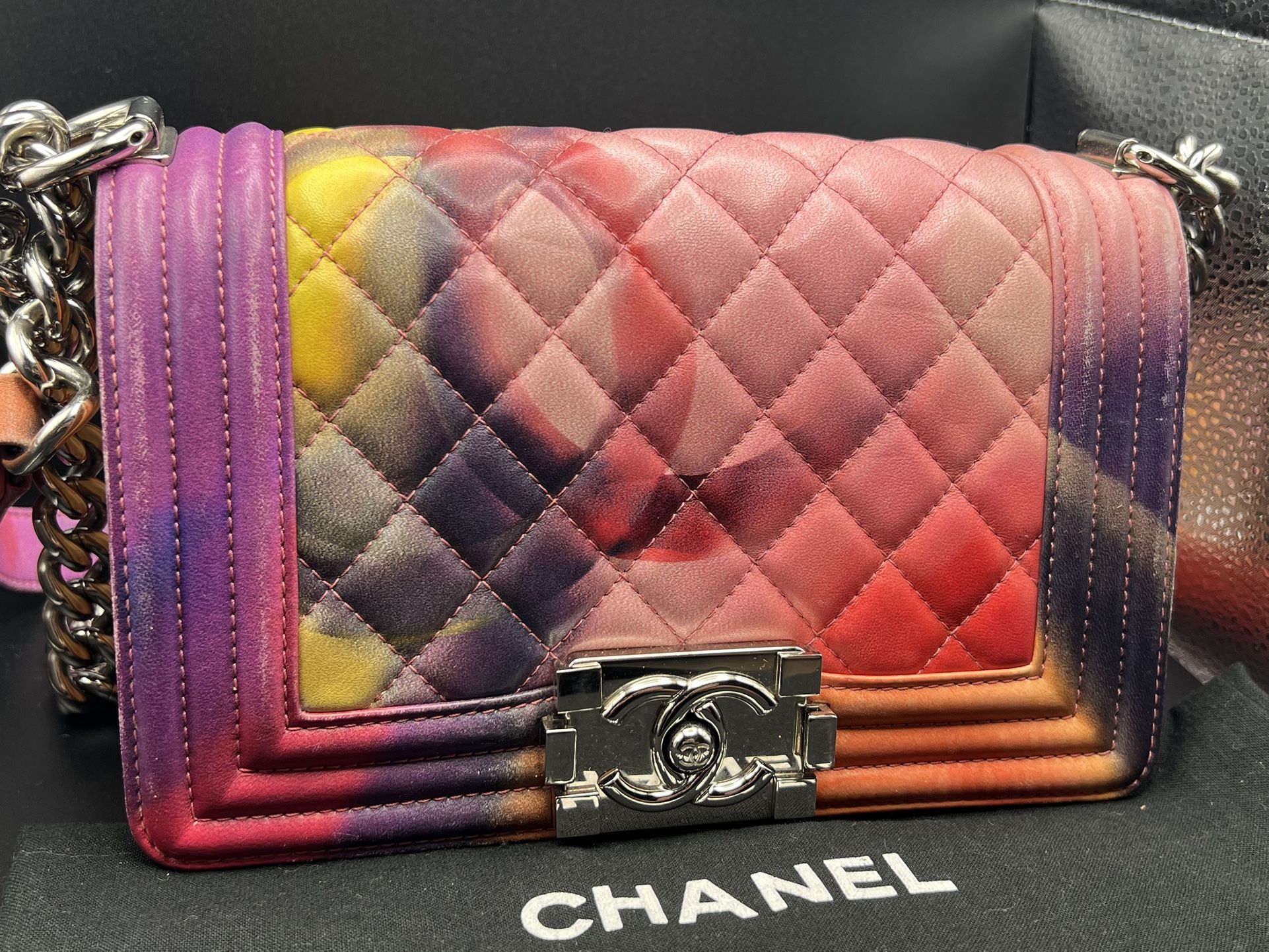 CHANEL lambskin small Flower Power Boy Flap in multicolor. Diamond quilted leather with colorful abstract Chanel CC design. Shoulder strap with a printed leather shoulder pad and polished silver chain link. Polished silver CC boy push-lock opens into a spacious black fabric interior with a single pocket. **Collectibility - rare collectors item, released during spring/summer 2015 season, designed by the late Karl Lagerfeld** Exterior: Quilted lamb skin leather in a multicolor/watercolor print Interior: Black fabric lining Hardware: Silver-tone polished hardware Features: Closure - signature boy logo push-lock Strap - adjustable chain link strap with a leather shoulder pad Interior - one spacious compartment with a single pocket Dimensions: Length - 8" Height - 5.25" Width - 2.5" Strap drop - 12.25" to 21.75" Includes: Dust-bag Disclosure: This purse has been gently pre-loved, minor corner scuffing, minor scratches on polished silver closure, light imprint from chain strap on back left side of leather due to storage (may go back to normal). See pictures. *No Refunds/Returns/Exchanges. Please view all pictures and read description.