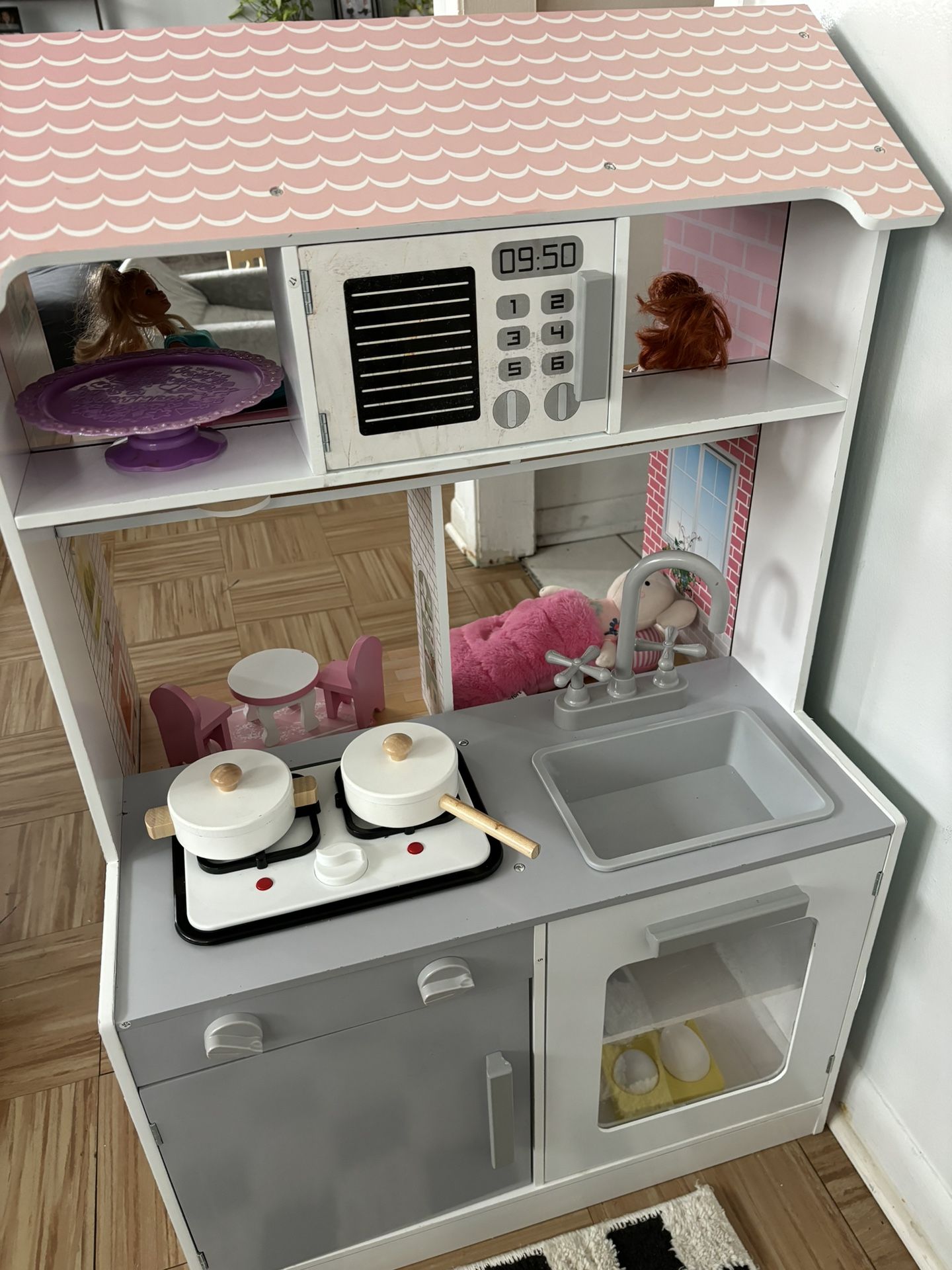 Cute wooden play kitchen on one side and dollhouse on the other. - Dolls NOT included just shown for reference make me an offer