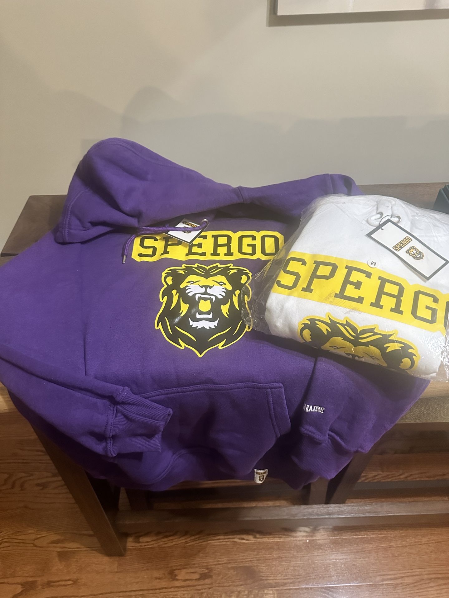 Spergo Hoodie sweatshirts- Size Med. - Brand New Price is for both. Size M - sized big could probably pass as Largr Purple and White.