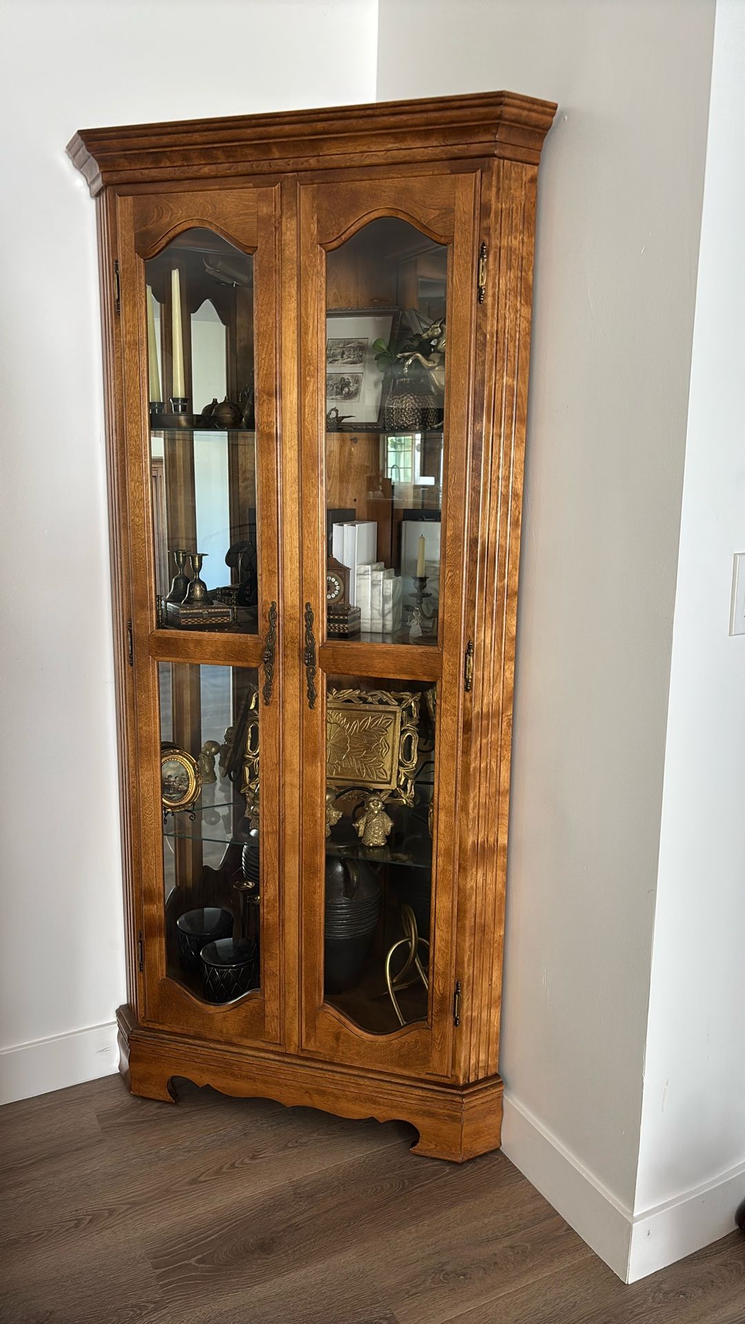This oak corner curio cabinet is a popular style for displaying collectibles, featuring glass display doors and a space-saving design. Cabinet has mirror backing and glass shelves. Content inside cabinet are not included.