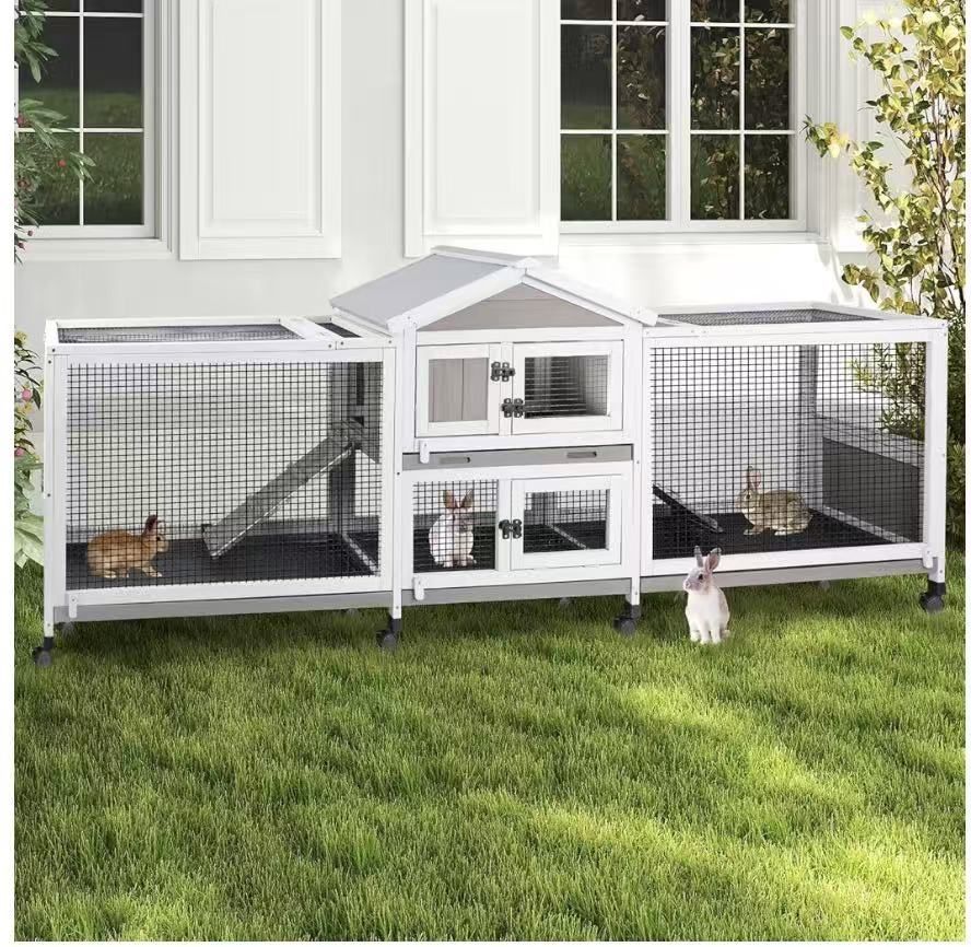 Double Rabbit Hutch Outdoor Indoor Large Bunny Cage with Dual Side Runs, 2-Story Wooden Hutch with 4 Leak Proof Trays, 8 Wheels, Waterproof Roof, Ramp, for Small to Medium Animals New Already assembled PET41