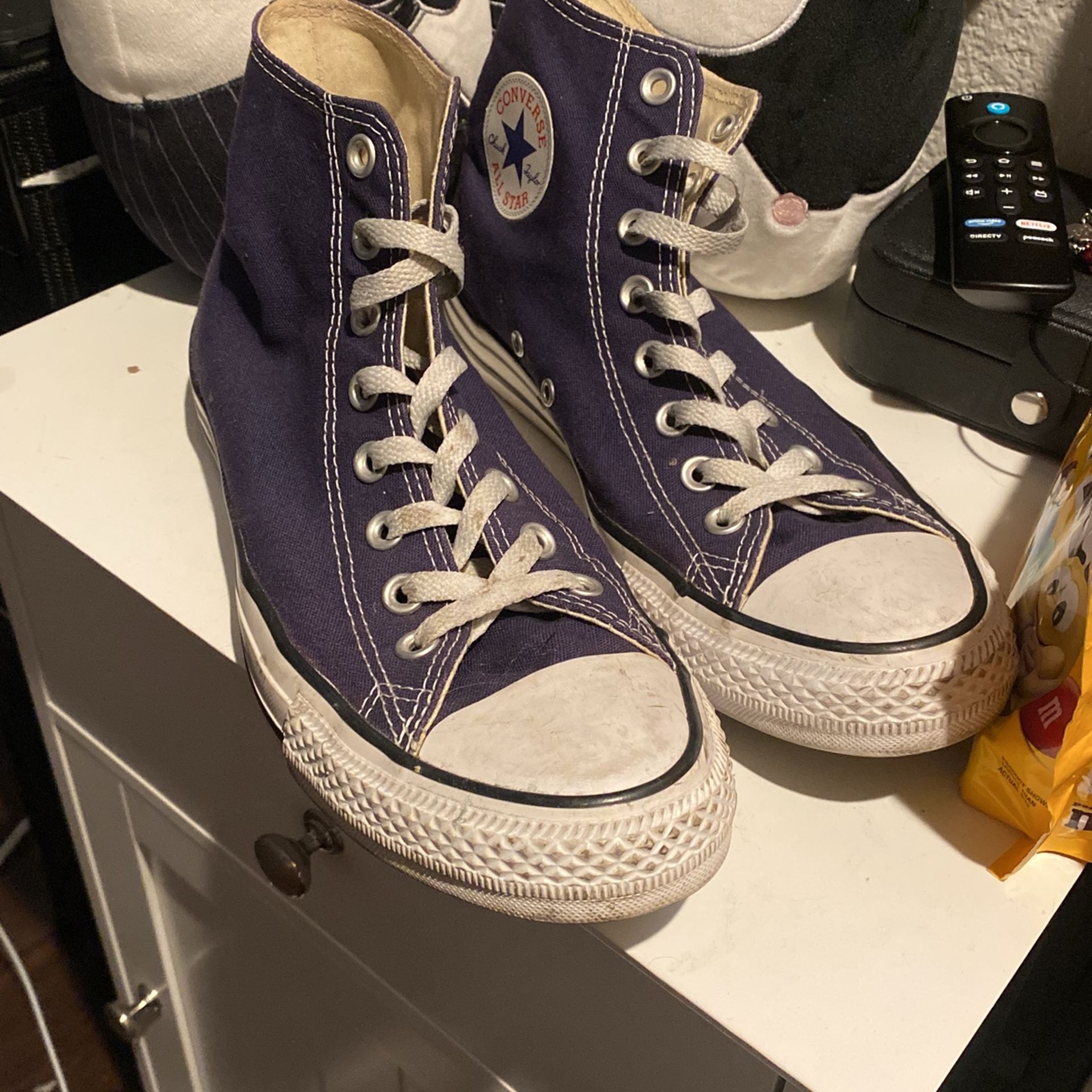 Purple colored converse, worn but rarely in good condition. I barely ever wore them because I bought them and then was gifted the black and white ones so I didn’t really want these lol. Size 10 in Womens
