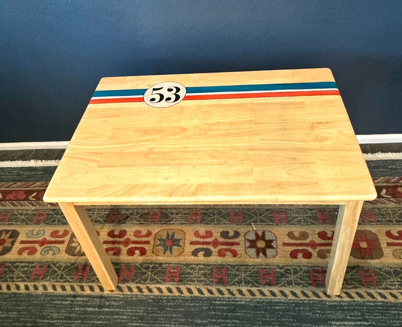 Refurbished children’s play table, sanded and hand painted “Herbie” design, with high gloss polyurethaned seal for durability.