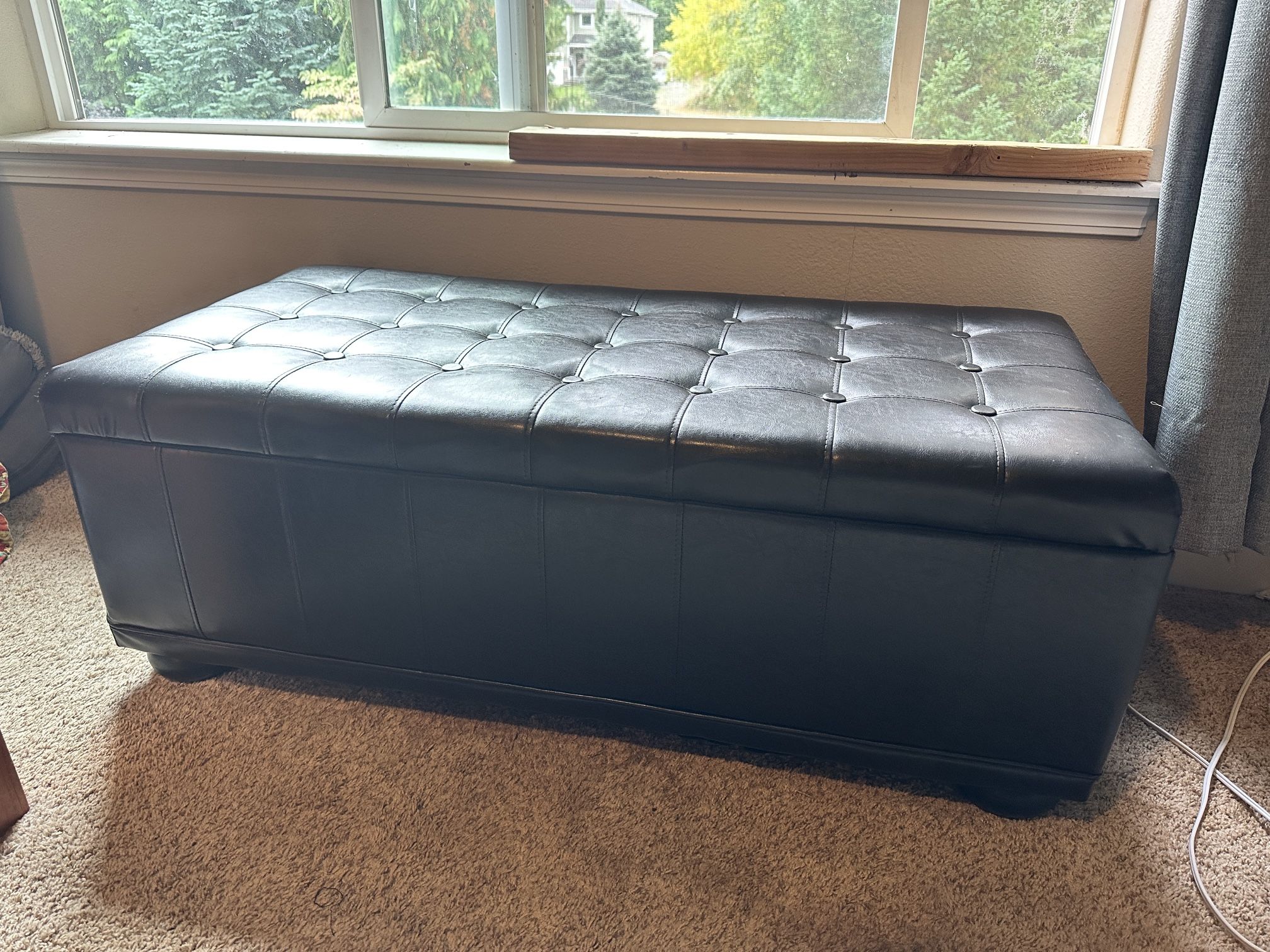 Black pleather storage bench. 44” long x 20”wide x16” high