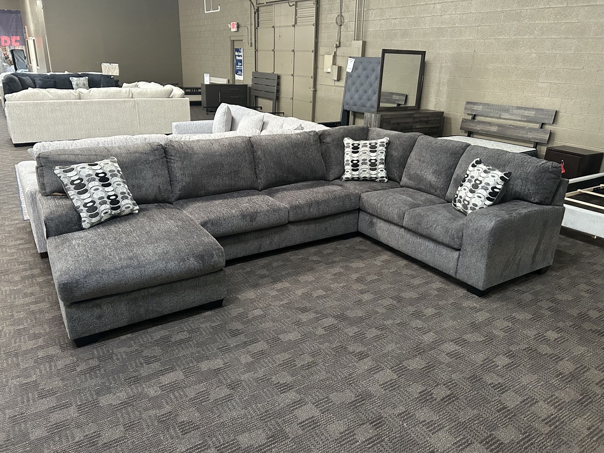 Brand new sectional. Soft grey fabric, plush comfortable cushions. Attached back pillows. Left or right chaise side available. Light grey or dark grey! Delivery and financing available