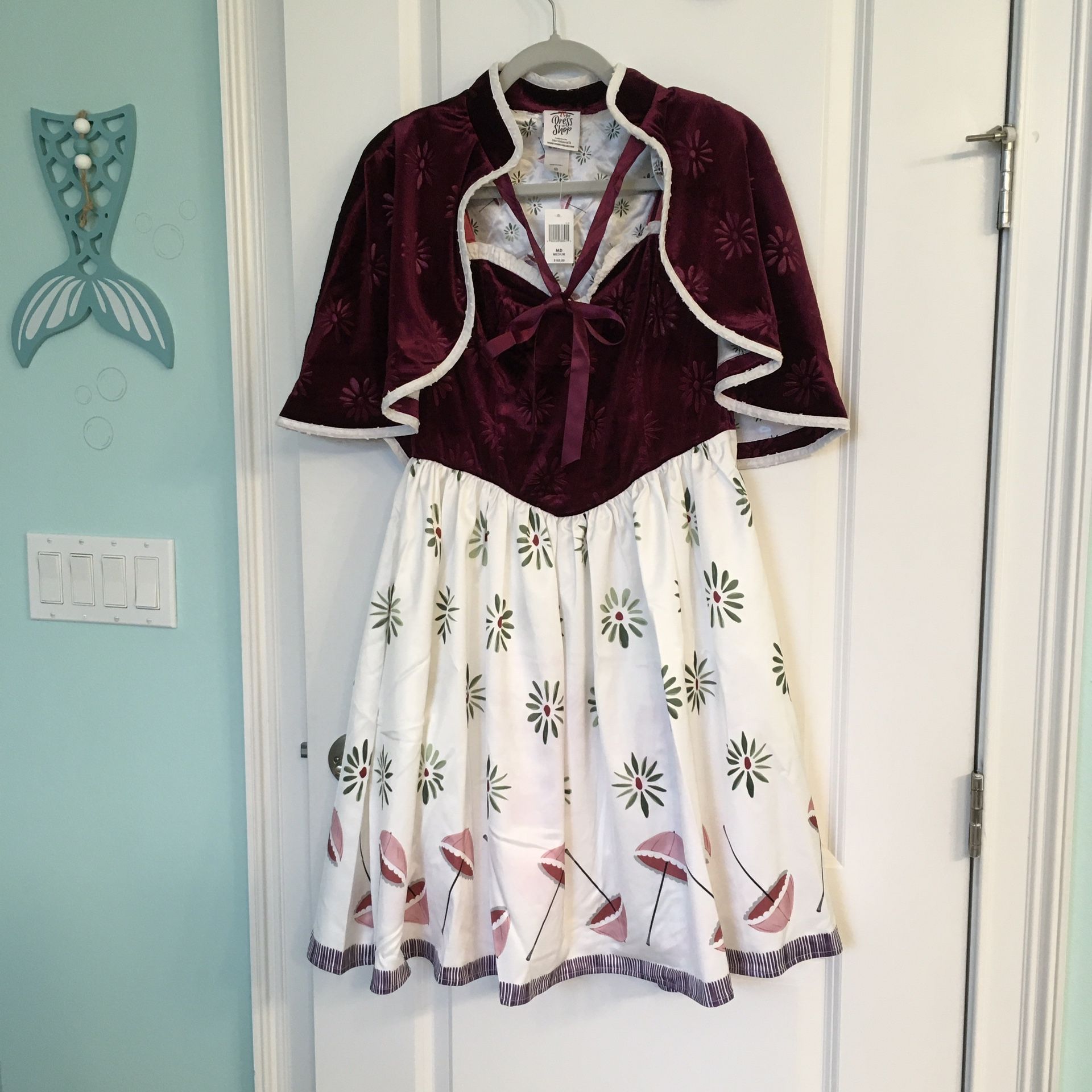 New with tag. Please see all pictures. There is a slight color bleed from the cape that happened in shipping, as seen in the photo, but it has never been warn. Zips at the side and has an attached petticoat. Make an offer!