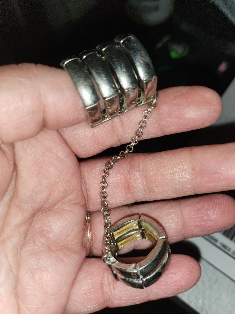 One of a kind gothic dual ring set w/chain. Both rings are silvertone & stretchy. Will fit an average size hand.