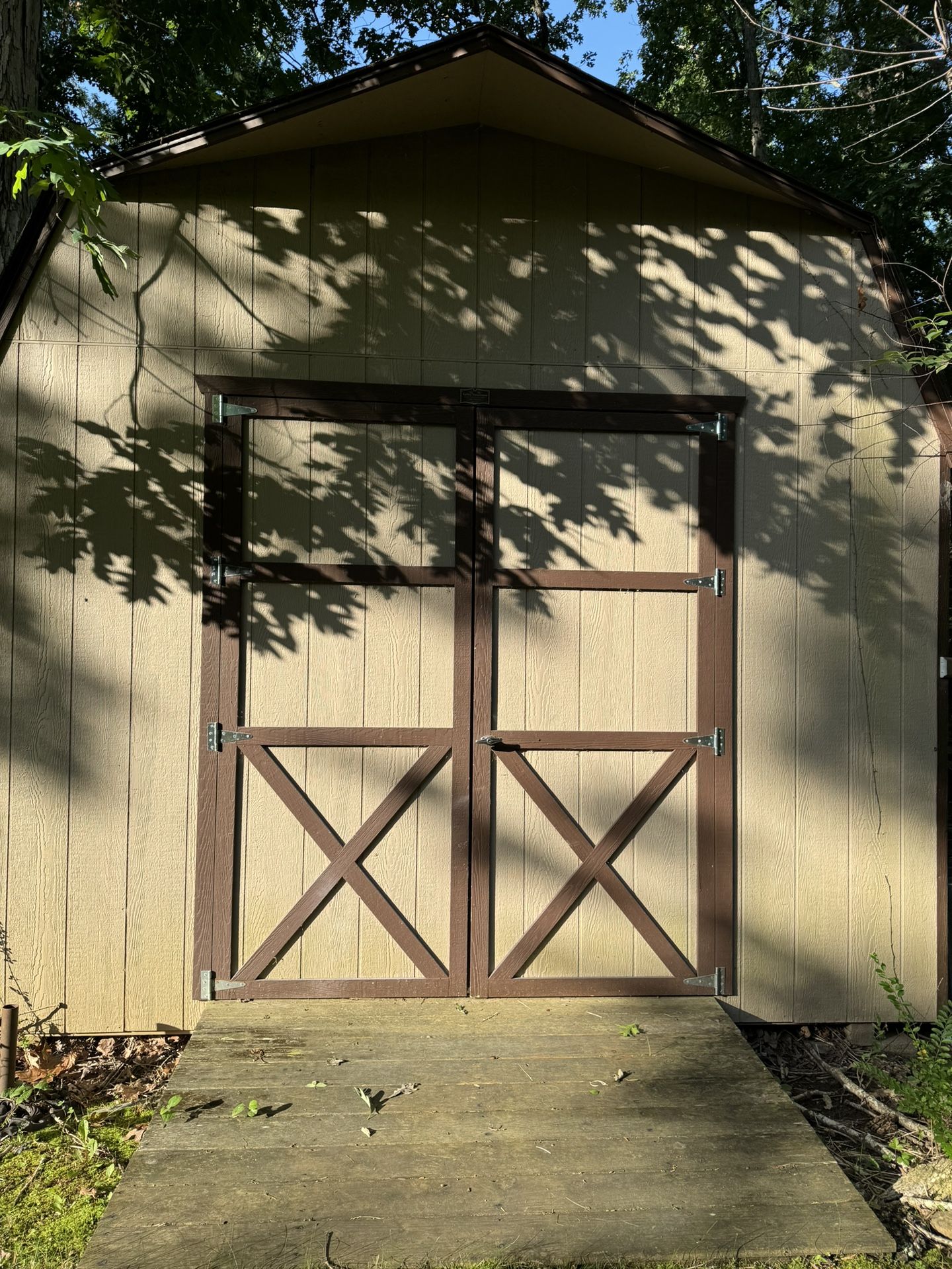 This is a great well built 12 x 20 Mennonite storage shed .. would be a perfect tiny home … with a lofted back area and a large work table on the right that runs the length of the shed .. great beige color with brown trim .. has the big double doors on the front .. shingle roof , windows on each side .. has the interior lined to help keep the heat down .. comes with the ramp … you must haul smoke and pet free it’s never had gas lawn mowers or tools in it .. 5800 obo