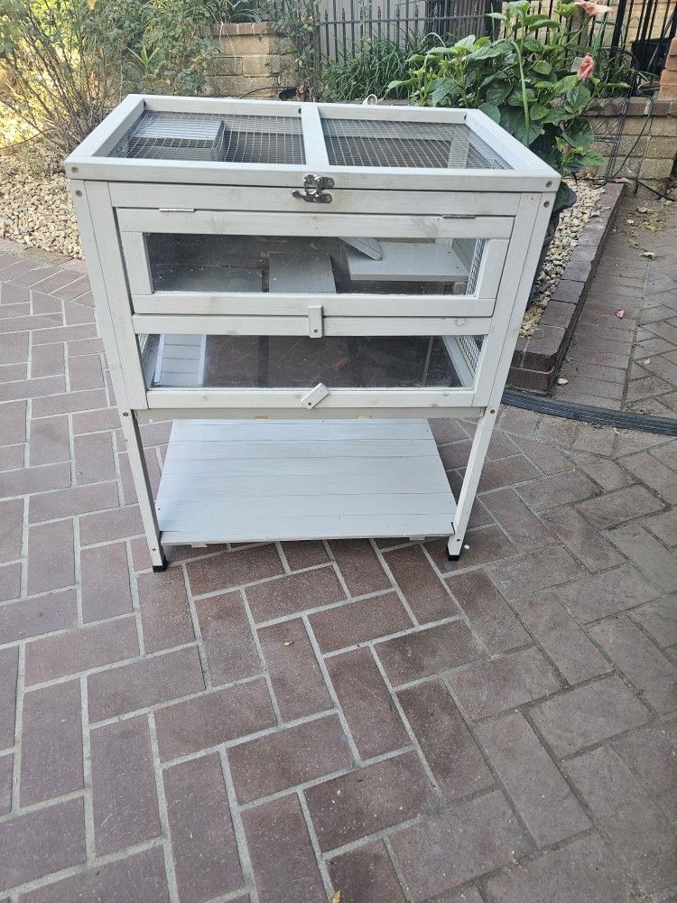 Wooden pet cage, 25-1/2" wide X 18" Deep X 31" tall. Used, very clean, refurbished. Pull out tray, two story, with storage shelf. Similar new on Amazon are around $105. Asking $60 OBO.