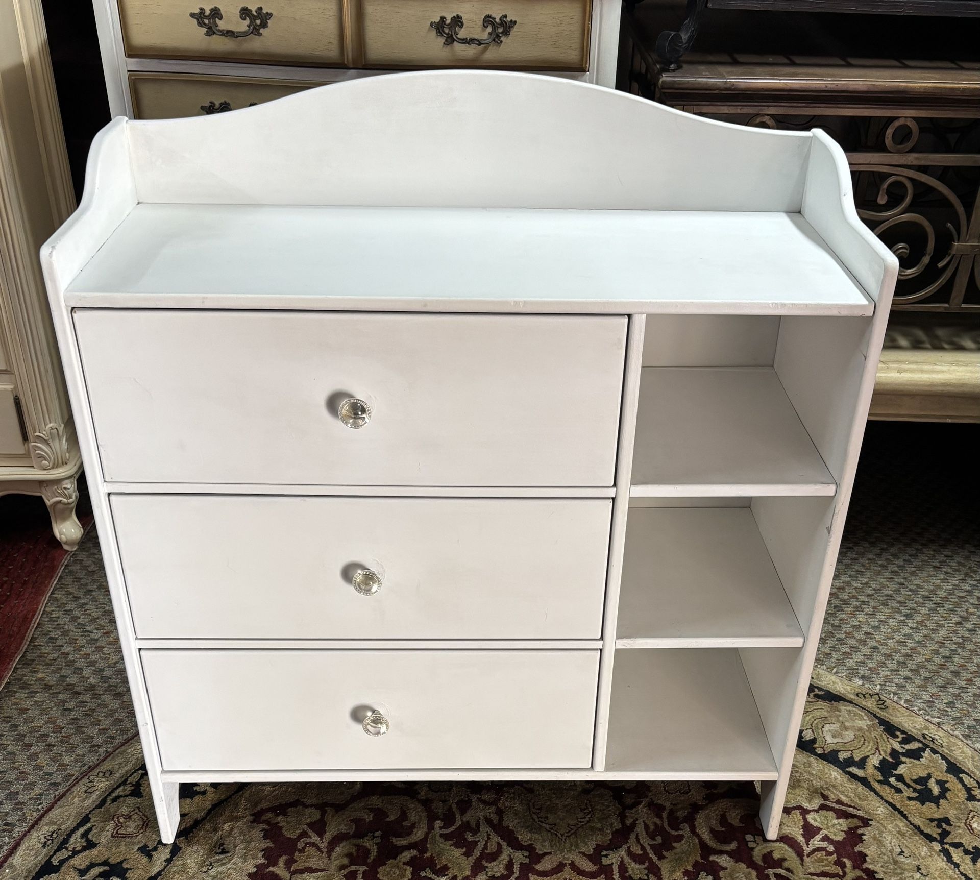 IKEA storage chest glass knobs three pull out drawers all slide smooth dual storage shelves 16x39 inch top 42 inches tall scratches from normal wear good condition $75