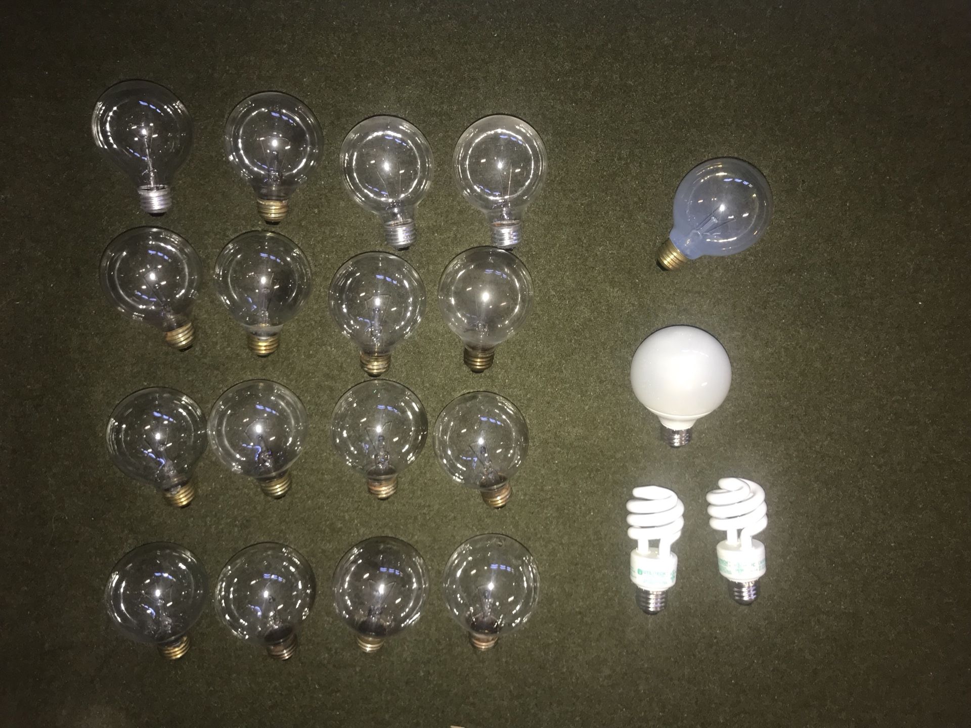 17 total: Sylvania, 120V / 60W Clear Globe w/ dimmer 2 total: Utilitech, 120V / 13W Fluorescent Coil w/ dimmer 1 total; Great Vaule, 120V / 14W Soft Globe