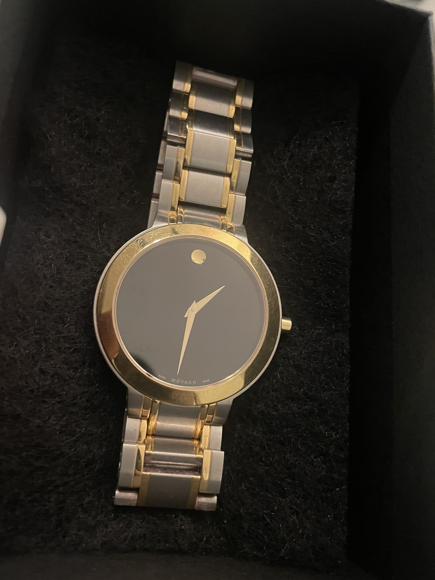 Movado Temo Quartz watch Black Dial, Silver, Gold Men / Women / Unisex Asking $350 obo Great for holiday season gift giving - Christmas present, Hanukkah, new years, birthdays. Black dial enhanced by yellow gold-tone hands. Yellow Gold PVD stainless steel case with a two-tone (silver-tone and yellow gold pvd) stainless steel band. Quartz movement. 30 meters / 100 feet water resistance. Fixed bezel Scratch Resistant Solid caseback
