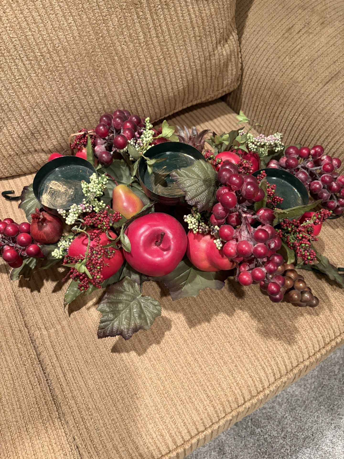Beautiful fruit spray three pillar candleholder. Can be used all year round. Excellent condition!