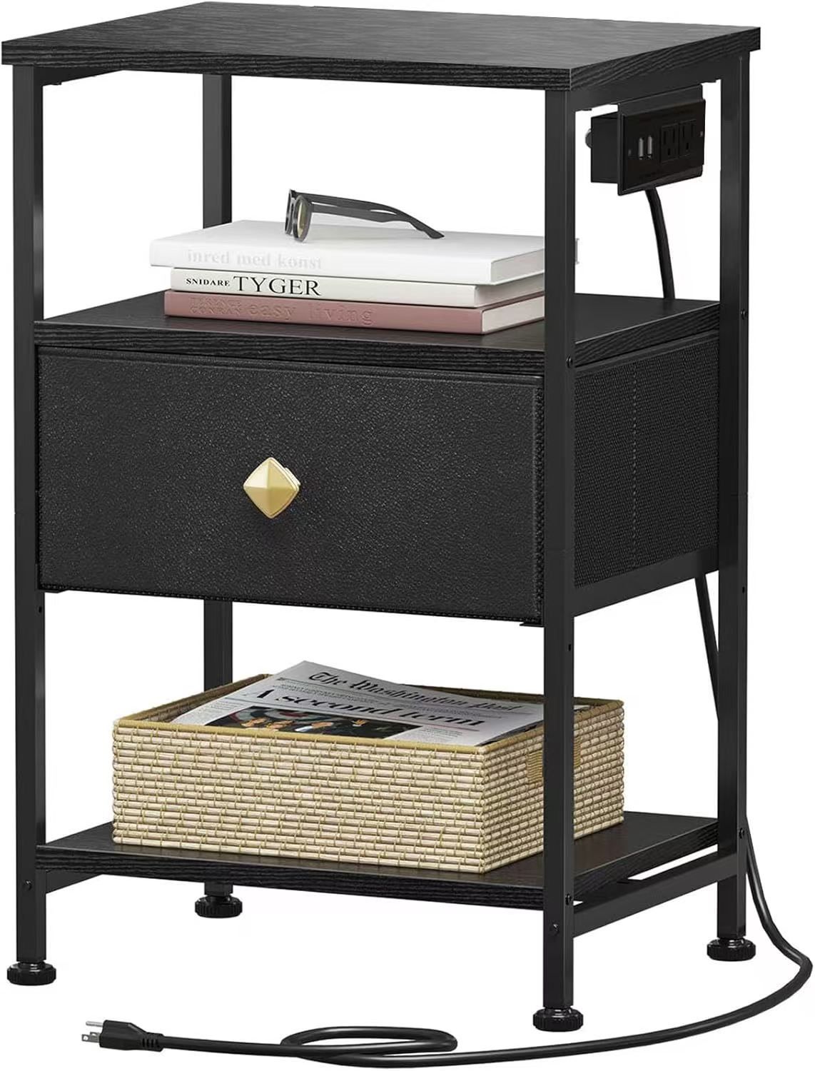 About this item HN005BL—1 ✩ Product dimensions: 15.75 "L x 11.81" W x 23.62 "H. ✩ Color: black and gold. ✩ Structure: Wooden waterproof top plate, sturdy steel frame, high-quality leather non-woven fabric combined with drawers.✩ Additional: Charging station, installation tools, installation instructions. 🔋[Nightstands with Charging Station] The modern side table is equipped with 2 AC power sockets and 2 USB ports, making it easy to charge mobile phones, headphones, watches, computers, etc. The charging station design of this small table is more user-friendly, install on the left or right side according to your usage habits, no longer occupying top space! ☺[Multiple installation forms] There are four installation methods for a product, and you can adjust the position of drawers and the height of open shelves according to your storage needs. The combination of drawers and storage racks provides more storage space, which can be used to store and place various items. ☺[Multi-Function Storage] This night stand can be used not only as a bedside table in a bedroom, but also as a sofa side table in a living room, toy display lockers for children, and more. Classic black with gold for a variety of room trim styles, which create a clean, serene and elegant atmosphere for your home. ☺[Sturdy] The end table with a charging station is made of thickened wood and sturdy steel, which is sturdy and long-lasting. 4 adjustable feet enhance stability, maintaining good balance even on uneven surfaces while avoiding floor scratches.