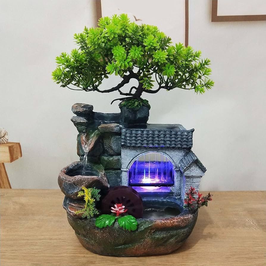 Indoor Waterfall Tabletop Fountain, 7.9x5.9x11.8in Flowing Water Tabletop Fountain Water Plants Waterwheel Fountain for Home Office Decoration