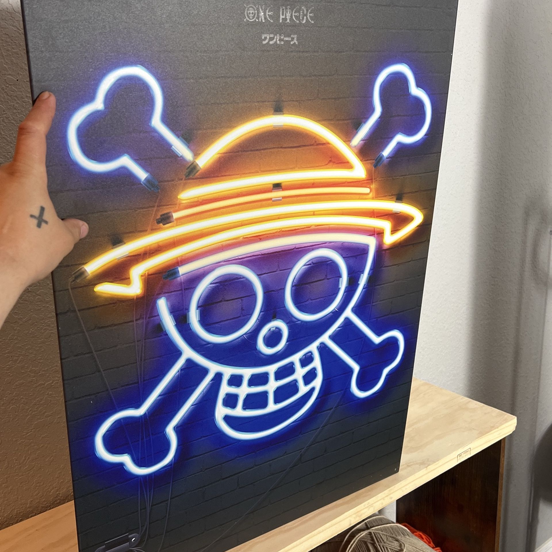It’s a metal poster of the Straw Hat pirates symbol. Bought it not that long ago, but I need more space! It’s a lightweight metal, yet it’s very sturdy. You would have to try and bend or dent it in order for it to get damaged. This thing is made to last.