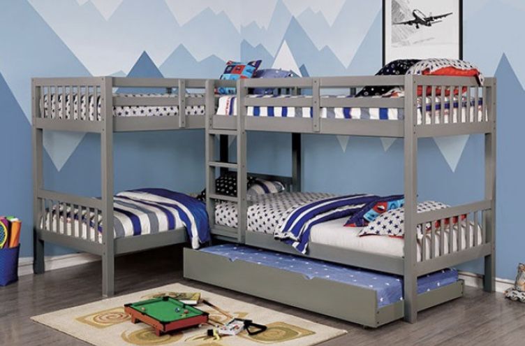 Host the best slumber party with this multi-level bunk bed that features four twin-size sleeping areas and an attached center ladder. The L-shape lets you tuck this into a corner and maximize your room space. The slatted panels and fence style guard rails are a classic look that goes beautifully with any room design. You can even get a separate trundle and add another mattress to this already impressive sleeping structure. Item # CM-BK904GY Gray Finish Transitional Style 4 Twin Beds Attached Ladder Corner Design 13 Pc. Slats Top & Bottom Optional Trundle Available Solid Wood, Wood Veneer, Others* Mattress Sold Separate Dimensions: 119 7/8″L X 79 7/8″W X 65″H *Some Assembly Required Manufacturer: Furniture of America