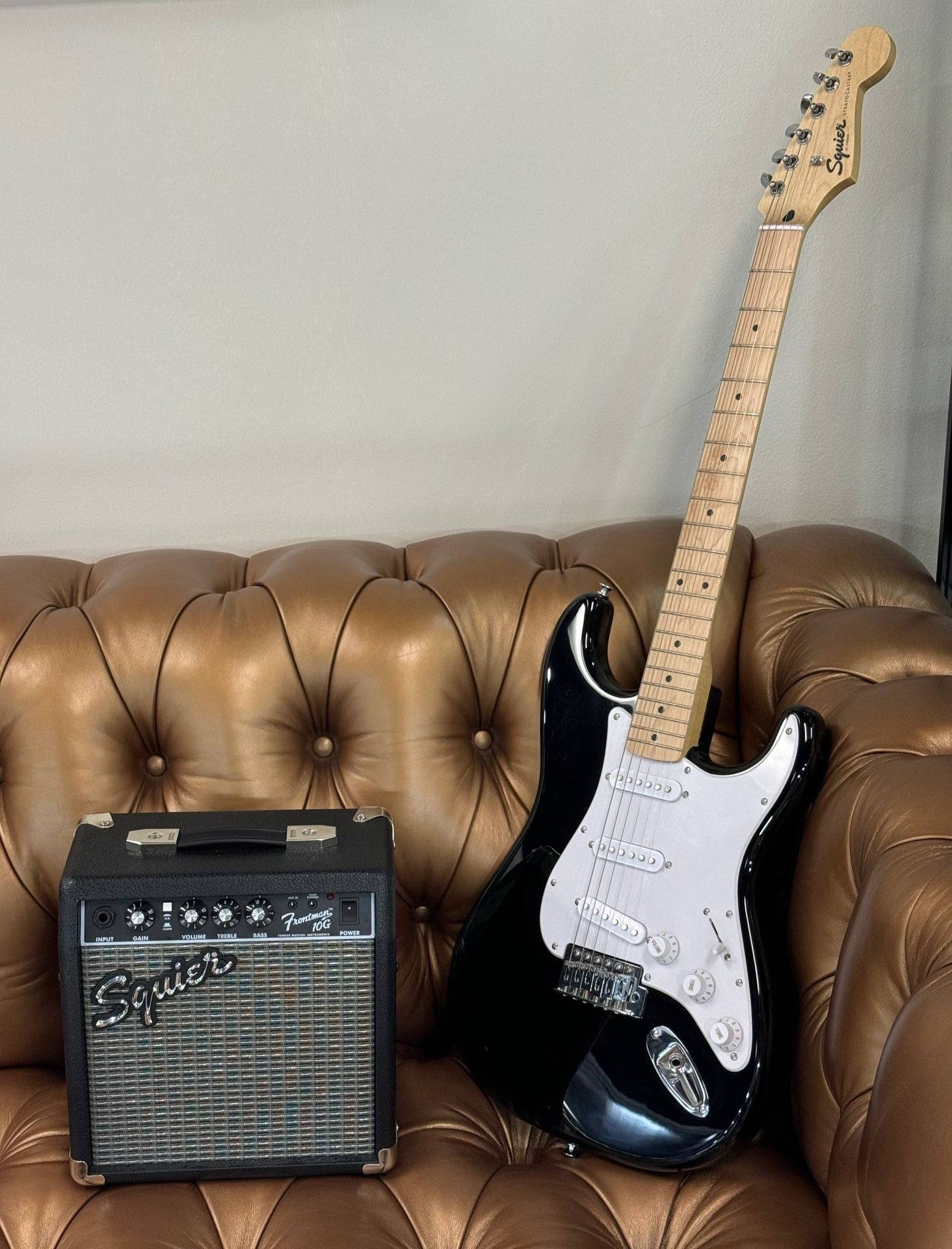 Squier Sonic Stratocaster Maple Fingerboard Electric Guitar – Black Panda + Frontman 10G Amplifier Unleash your sound with the Squier Sonic Stratocaster, a modern take on the legendary Strat® design. Finished in the eye-catching Black Panda colorway, this 6-string electric guitar offers classic style paired with smooth, responsive playability. Its maple fingerboard provides a bright, snappy tone and a comfortable feel that suits beginners and seasoned players alike. Very good and clean condition