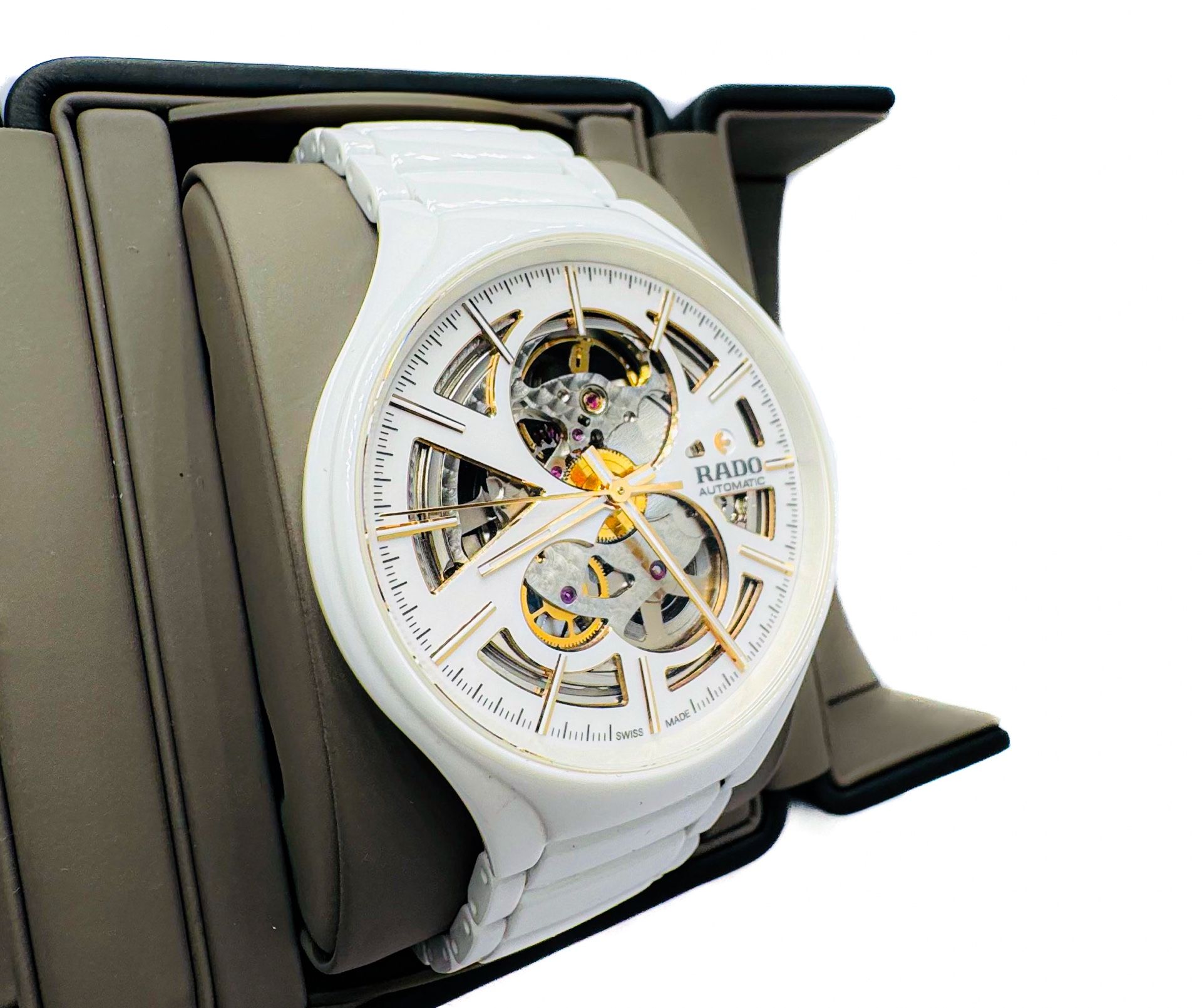 Rado True Round Automatic White Dial Unisex Watch Original box and Pouch Full set Case Diameter: 40” Case Thickness: 10.4 mm Case Material: Ceramic and Titanium Case Back: Transparent