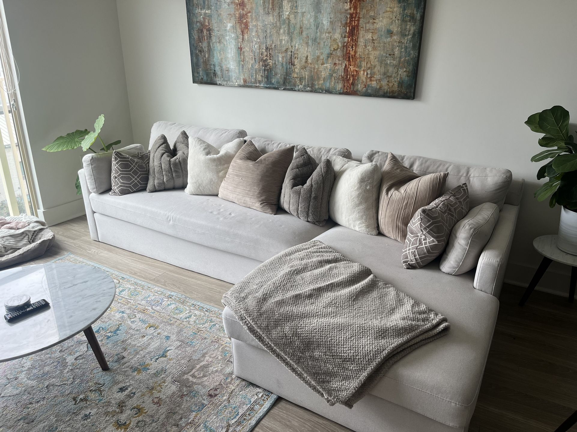 Beige sectional sofa 108in long Left sided chaise Used in great condition Feather pillows included