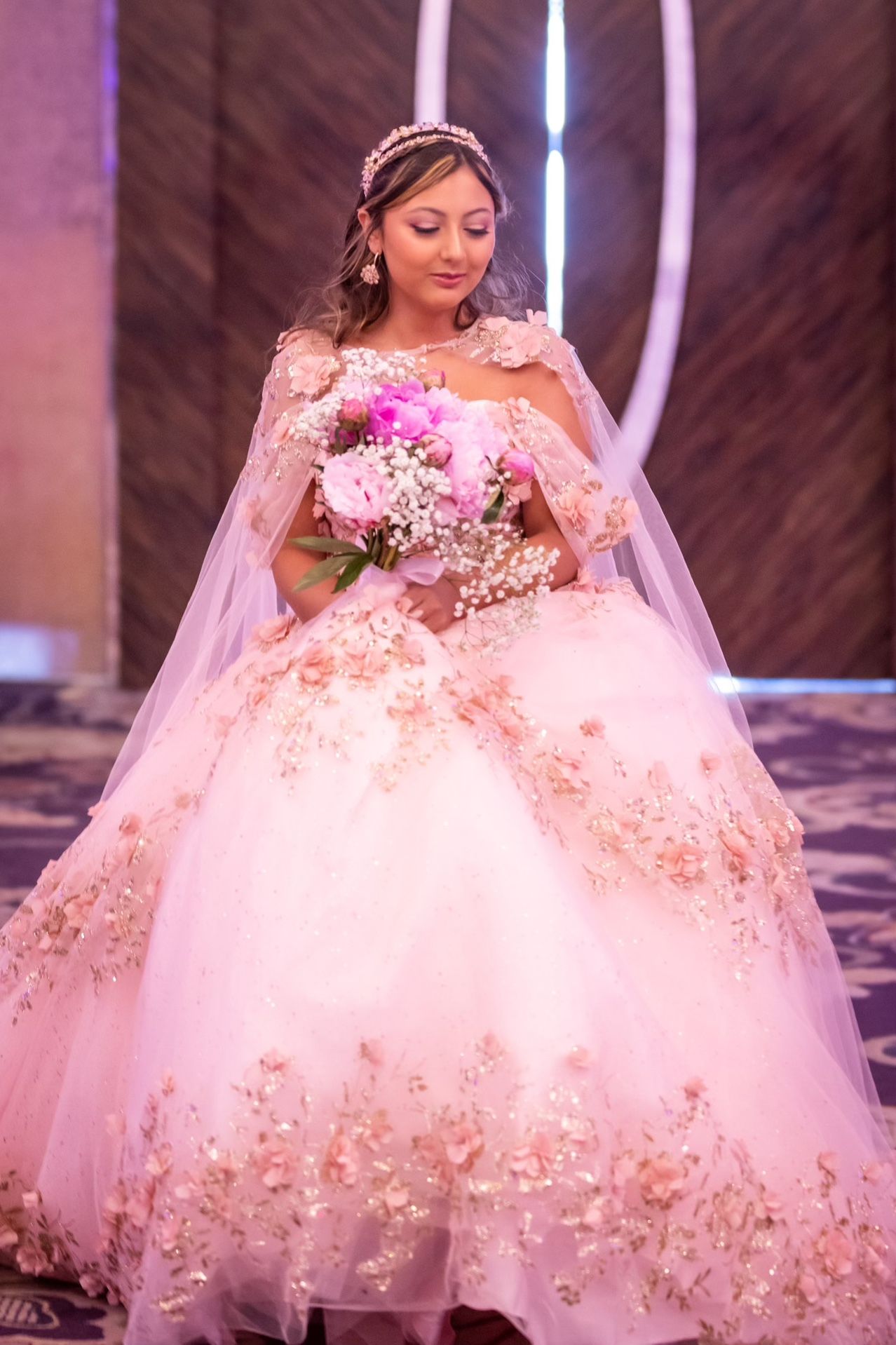 Quinceañera Dress – Blush Pink Floral Ball Gown with Cape