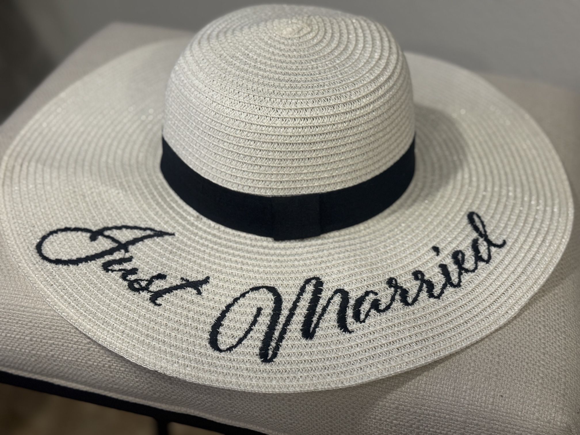 Stylish wide brim hat with 'Just Married' embroidery. Perfect for a bride on her honeymoon!