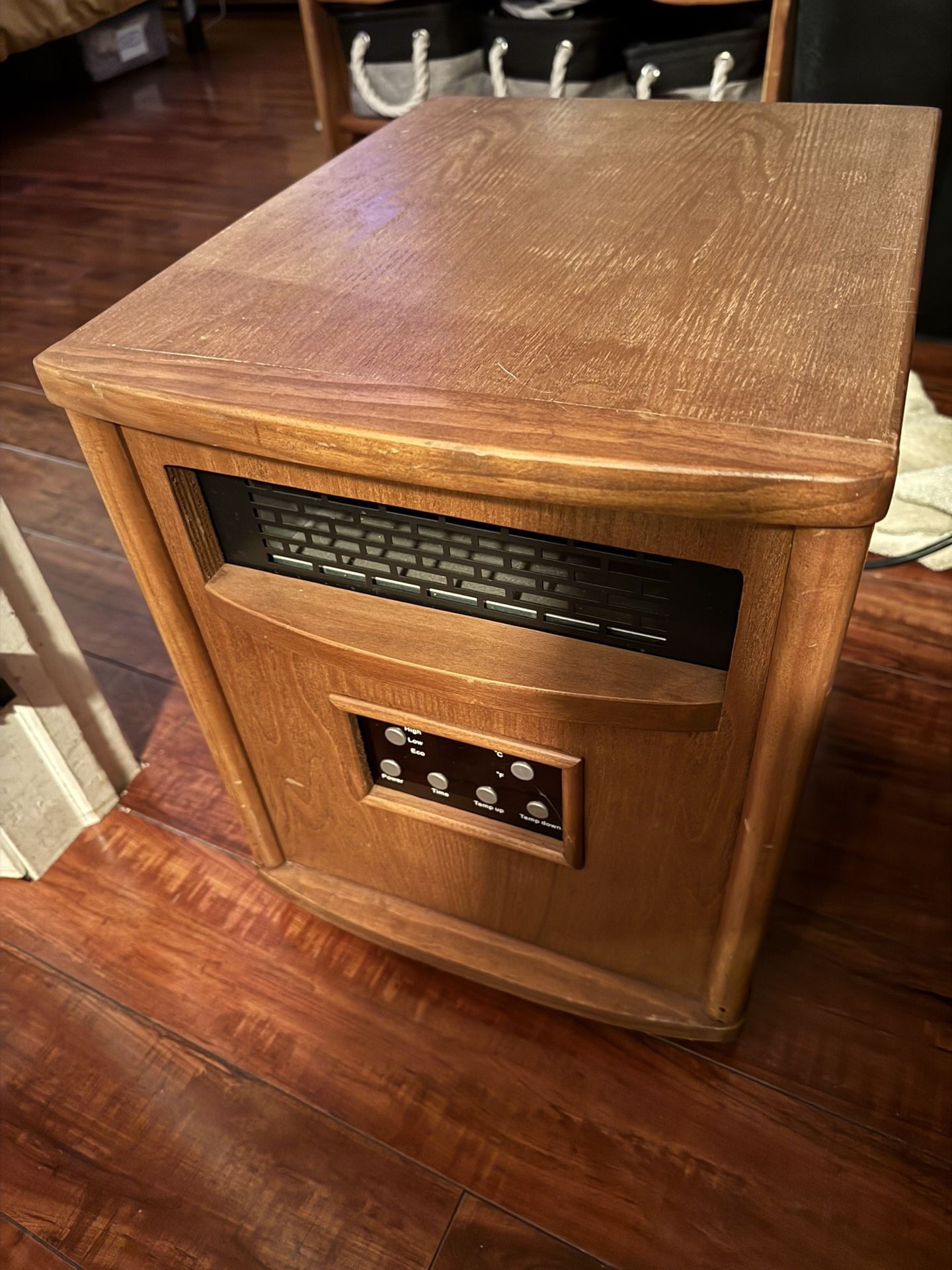 They don’t make heaters like this, hard to find. Beautiful wood cabinet, not an ugly eye sore in your room. Produces strong, very warm heat, enough to fill a very large room. It is solid, you’ll never have to worry about it tipping over like lots of heaters do. Paid over $100,, Have one extra, is your opportunity to own one like this.