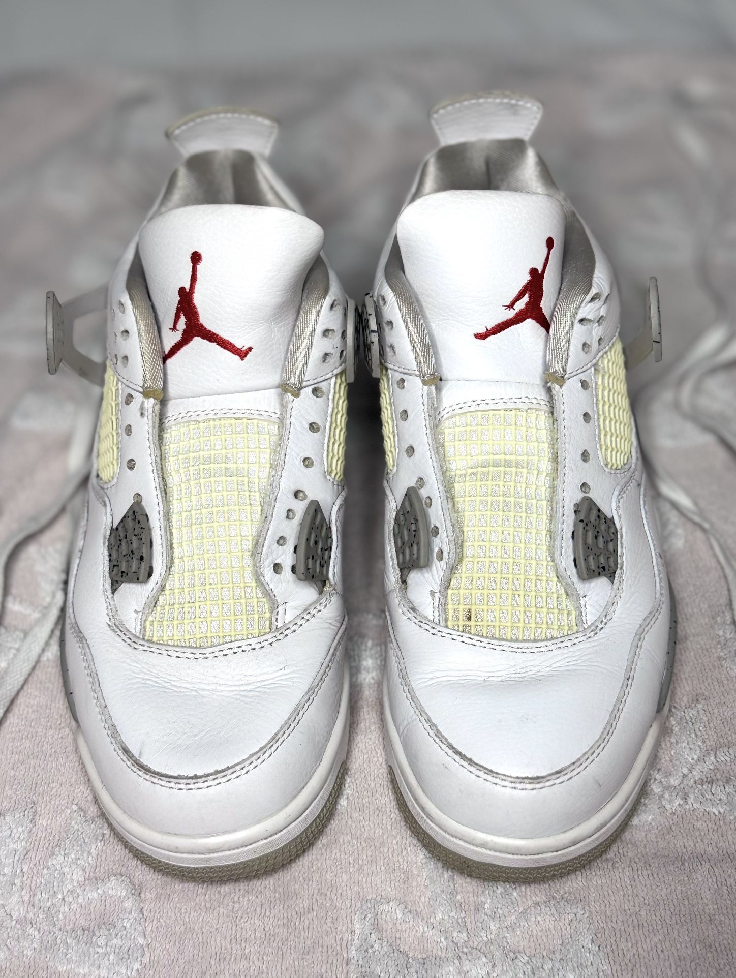These are the classic White Oreo Air Jordan 4 Retros, a colorway that’s no longer available at retail and hard to find now. The shoes have a noticeable signs of age, but they’re still great for collectors, restorations, or anyone who likes that vintage, broken-in look. They do come with their own shoe laces.