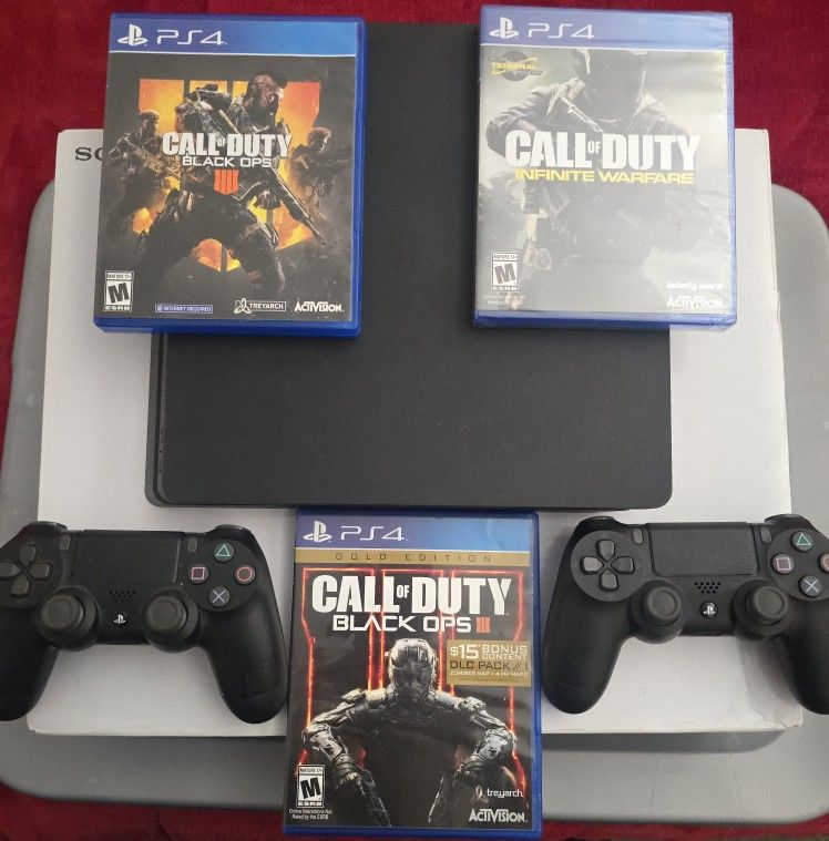 PS4 with 2 controllers, 3 Call of duty games. Working condition with cables and box included