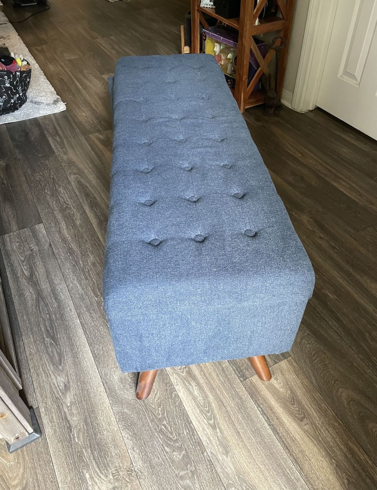 Upholstered storage bench, bought from target about a year ago. Does have some imperfections shown in picture including dent on the back right but it still opens and closes perfectly. The dent can’t be seen when it is against a wall or bed. Will take offers if can be picked up