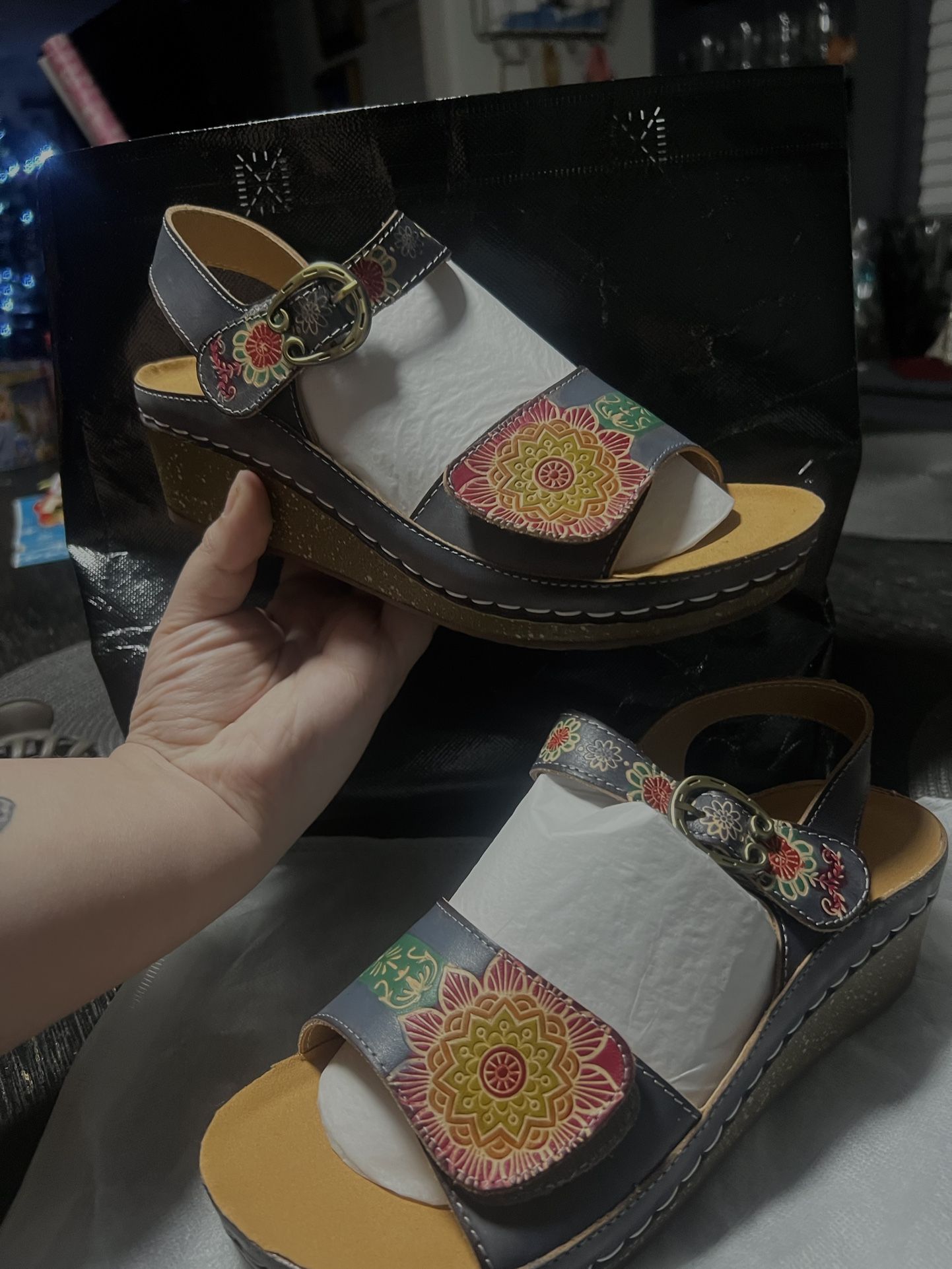 Beautiful L’Artiste by Spring Step wedge sandals with multicolor floral/mandala design. Very comfortable cushioned footbed with adjustable buckle strap. Great for spring and summer outfits, festivals, or everyday wear.