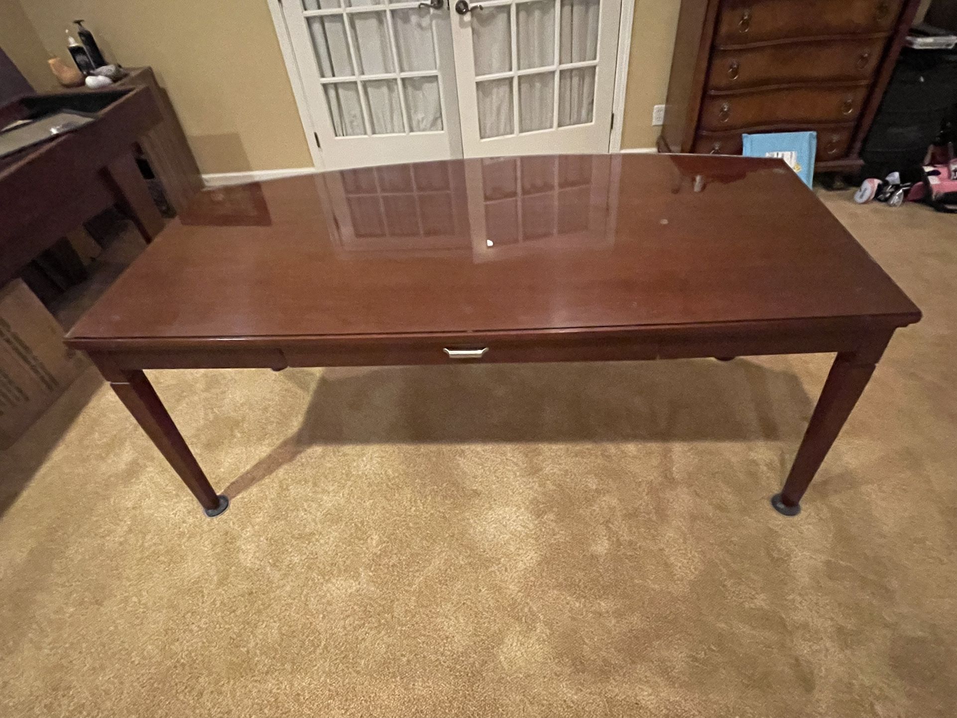 Solid wood writing desk with center drawer. Includes custom glass top. Very good condition. 72”x36”.