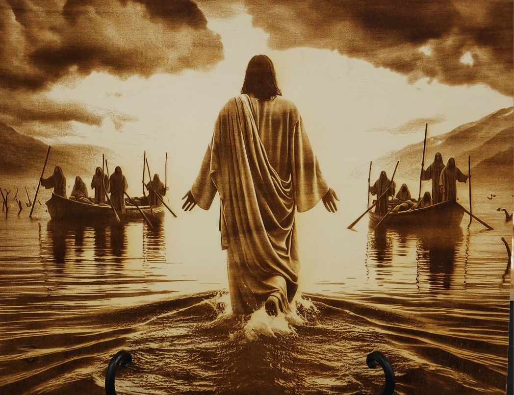 This is a monochromatic image is a striking depicting of one of the most famous biblical miracles of Jesus walking on water, which is recounted in the Gospels of Matthew, Mark, and John. The composition includes Jesus in the foreground with his back to the viewer, walking across a calm, reflective body of water. He is dressed in a long robe, and his outstretched arms suggest peace or divine authority. In the background, a group of disciples can be seen in a boat, observing Jesus. The dramatic, overcast sky adds to the atmosphere of reverence and awe. The setting features a serene lake surrounded by mountainous terrain. * Clear coated for extra protection and made to last! Ready to hang, with felt pads on the back. * Size: 18"x 14" Shipping will be $10 https://offerup.com/redirect/?o=aHR0cHM6Ly9vb3BzaWlua2VkLmNvbS9jb2xsZWN0aW9ucy9sYXNlci1lbmdyYXZpbmc=