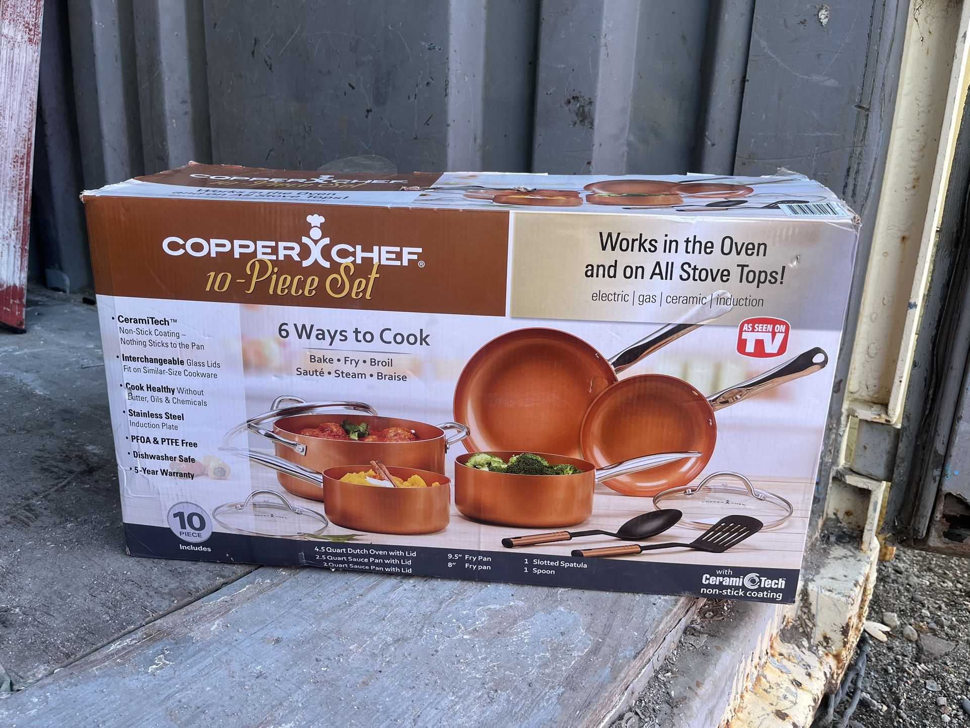 Brand new, never used 10-piece Copper Chef cookware set. All items are still in their original factory plastic packaging
