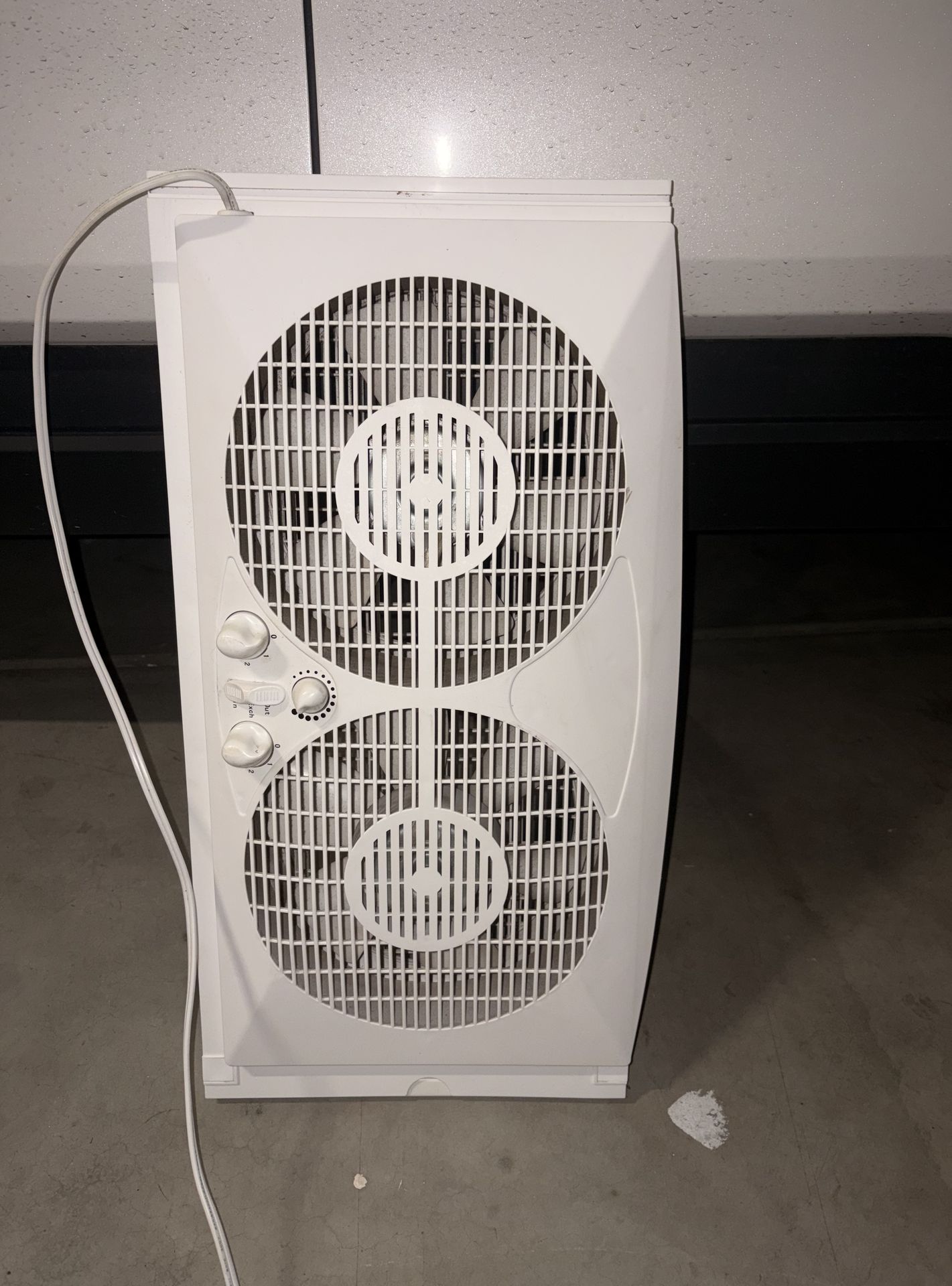 Dual window fan with two fans and adjustable speeds. Great for cooling a room, circulating air, or pulling fresh air in through a window. • Two fan speeds • Fits most standard windows • Works well and moves a lot of air Pickup only. Currently stored in my garage.