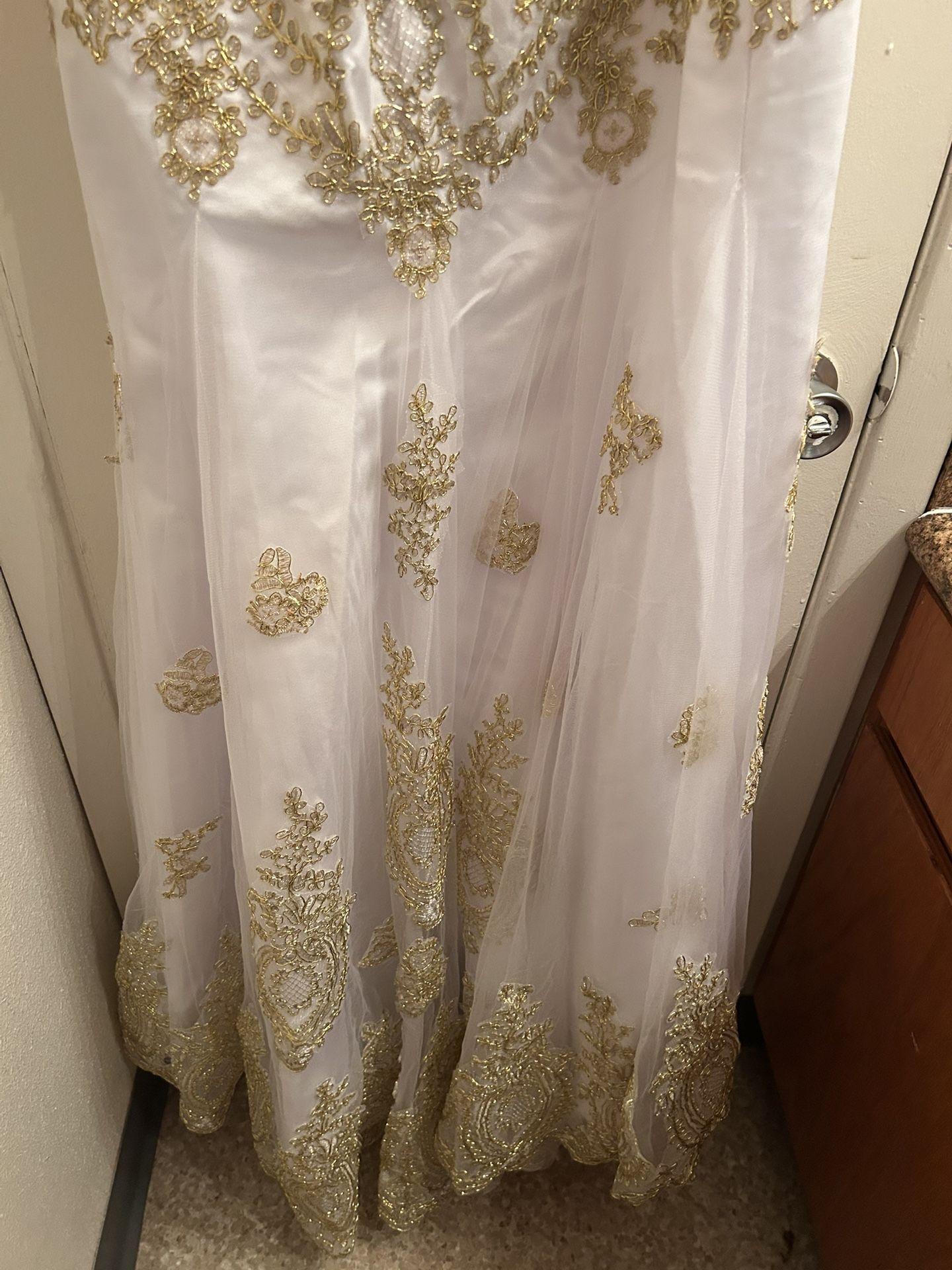 Bought never used! Got this beauty and decided to go with something more flattering for my body shape! It’s a size 8 women’s and the pictures don’t even capture the full beauty of this dress!!