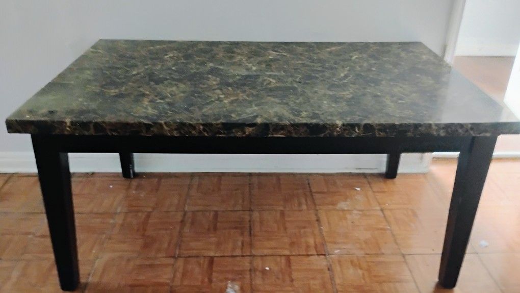 Black with green veins granite table top with a chestnut frame and legs.