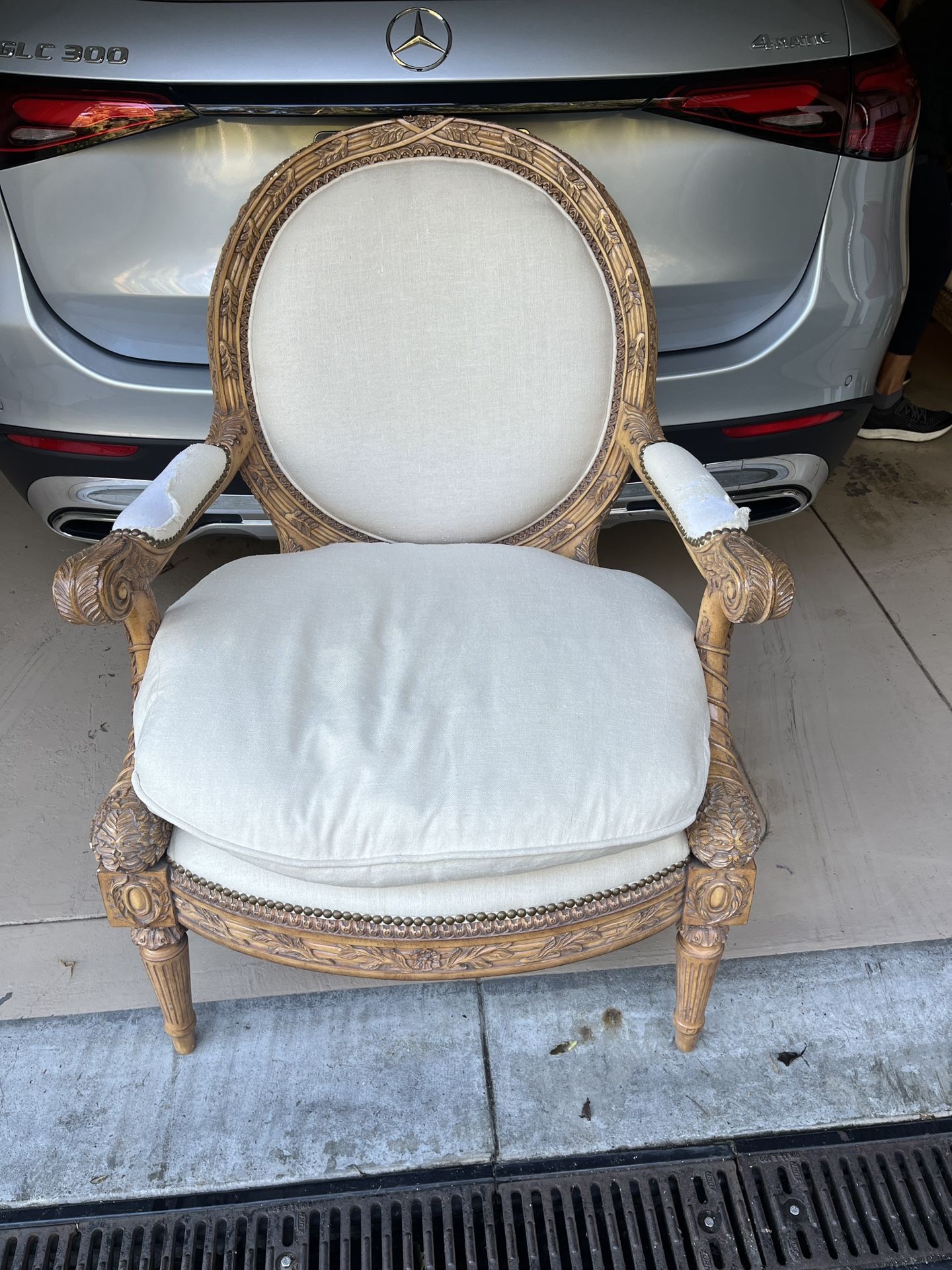 French Louis XVI Bergere chair by Maitland Smith Beautifully carved wood Needs new upholstery 31" wide 42" high in back 25" deep 28" arm height 21" to top of seat from floor I have 3 of them. $499 each. Cash only Easy pick up in San Francisco
