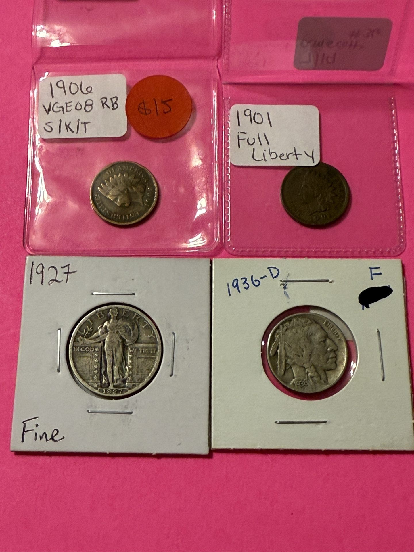 1901 Indian head cent full liberty 1906 Indian head cent 1927 Standing Liberty Quarter 1936-D Buffalo Nickel