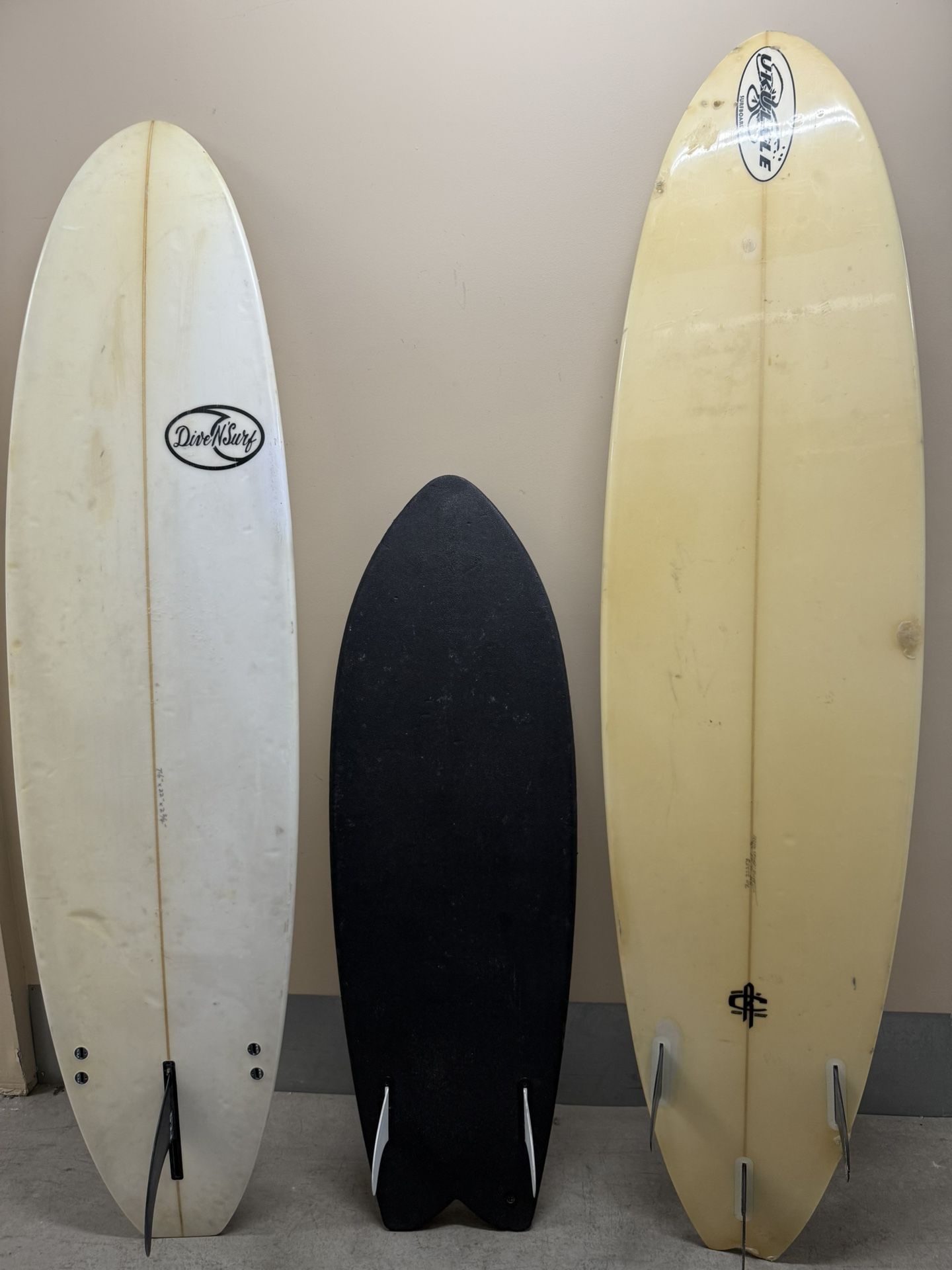 1. Dive N’ Surf longboard (white) $200 • Type: Longboard / funboard • Condition: Used, pressure dents, normal wear, no obvious major damage • Brand reputation: Solid local shop brand 2. Formula Fun fish (yellow/black smiley) $200 • Type: Fish / funboard • Condition: Used but fun graphic + recognizable brand • Appeal: Great beginner/intermediate board. 3. Ukelele / South Bay–style funboard (yellow, patterned deck) $200 • Type: Funboard / hybrid • Condition: Heavier use, yellowing, visible wear 📦 Bundle option: All 3 together: 💰$500