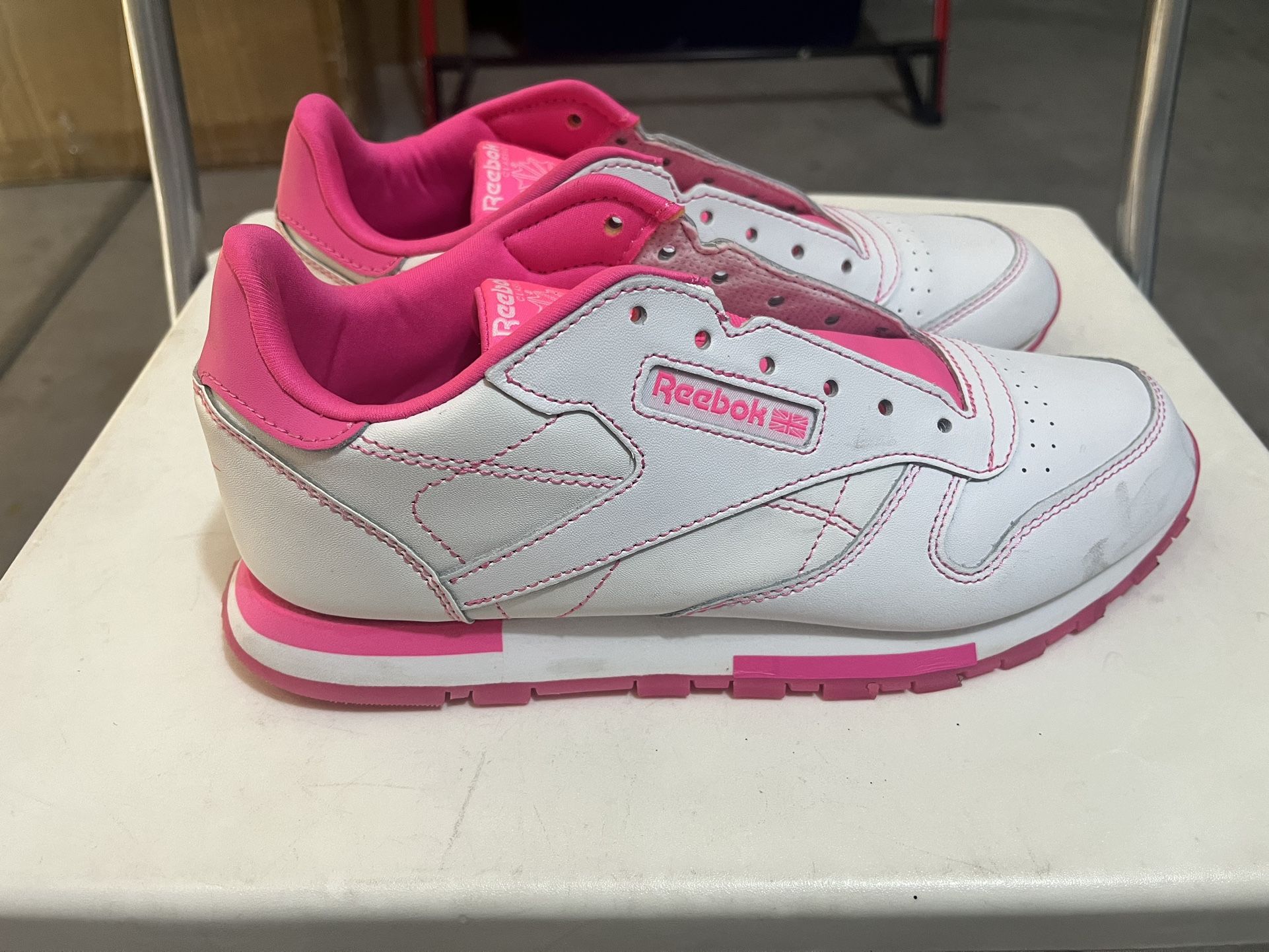 Pair of Reebok have been marked “like new” due to the fact that my 10 year old daughter foot keeps growing like she’s an alien lol and she only wore these shoes maybe once if at all. The shoes look new as you can even see how clean the bottoms of the shoes are in the photos. May have spent about $60 for them only asking for less then half that price for great name brand quality shoes. Pink/White Pumas are 6.0