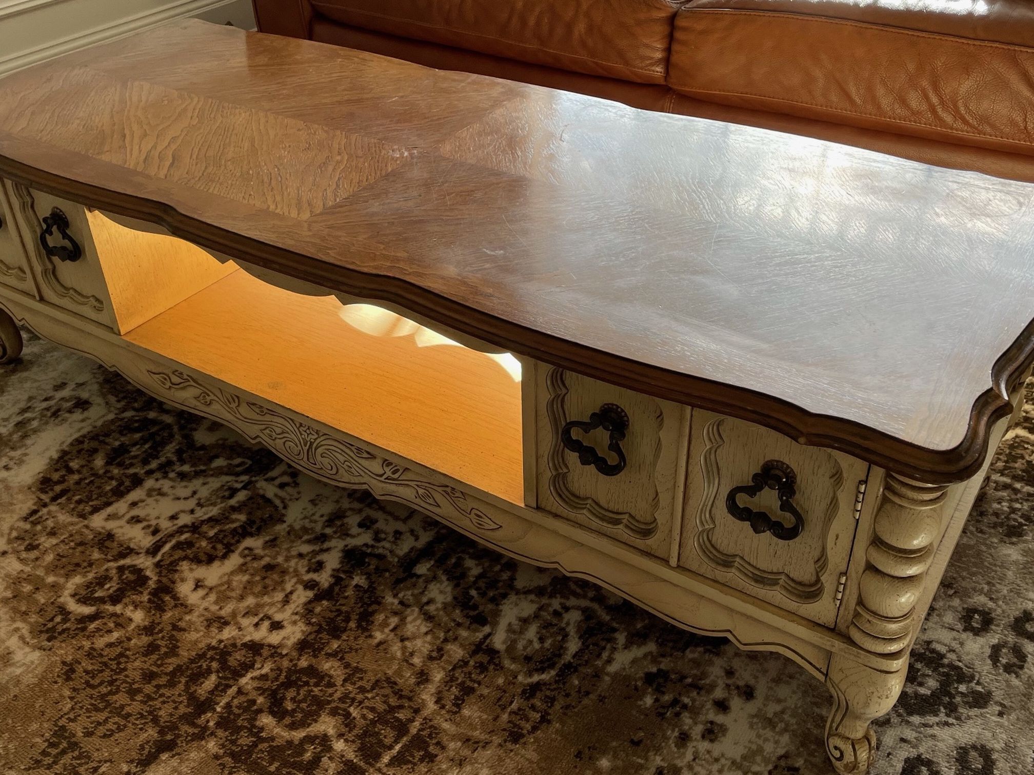 Cream white solid coffee table with storage. L-59in W-24 in H-17in