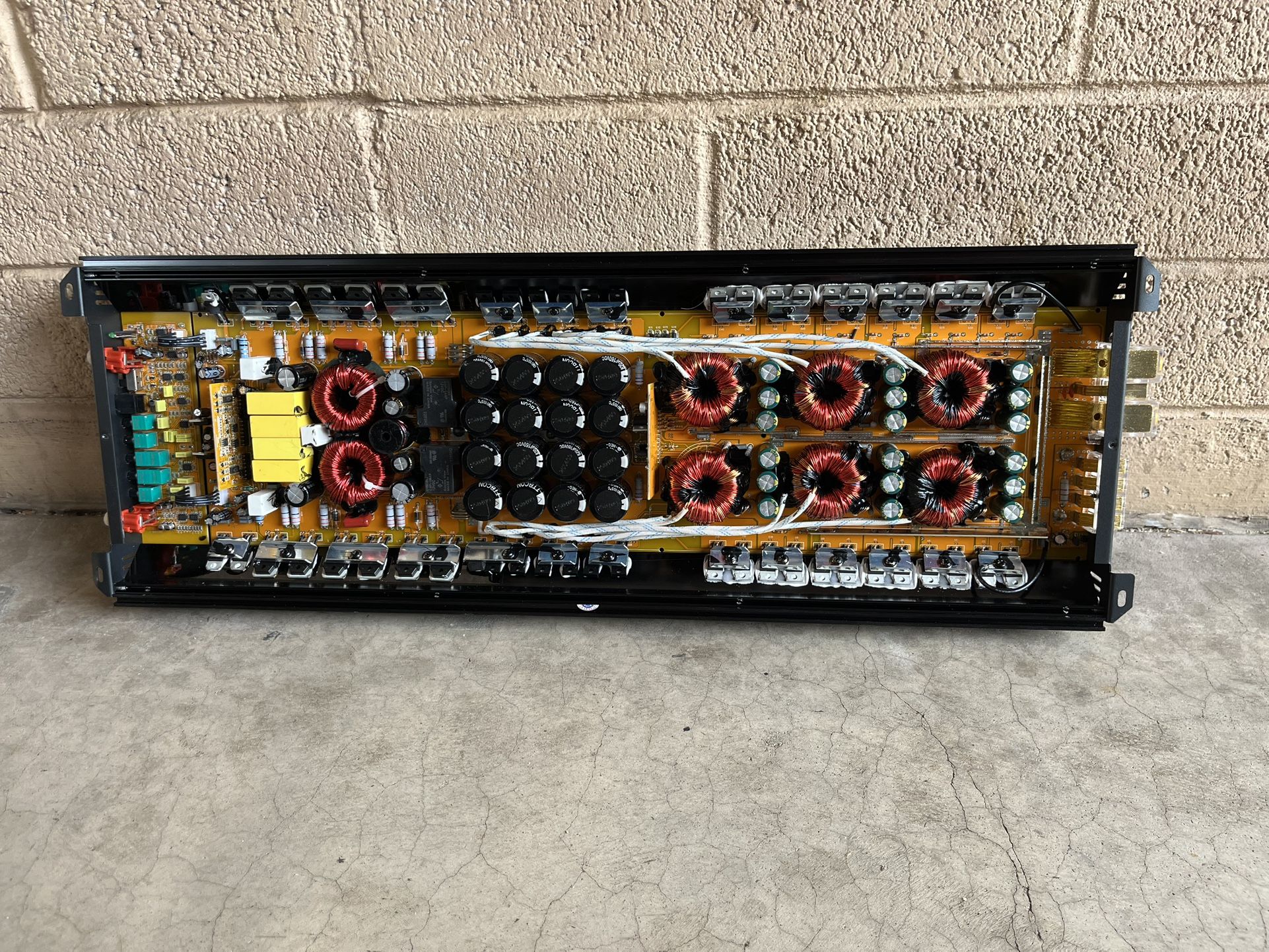 Huge surfboard amplifier with HUGE POWER Mrmusicman KING KONG 5.8k 0 Gauge power & ground inputs 5,800RMS watts - 1ohm 3,200RMS watts - 2ohm 2,200RMS watts - 4ohm 6,500RMS watts - HALF OHM 500a fuse required Bass knob included