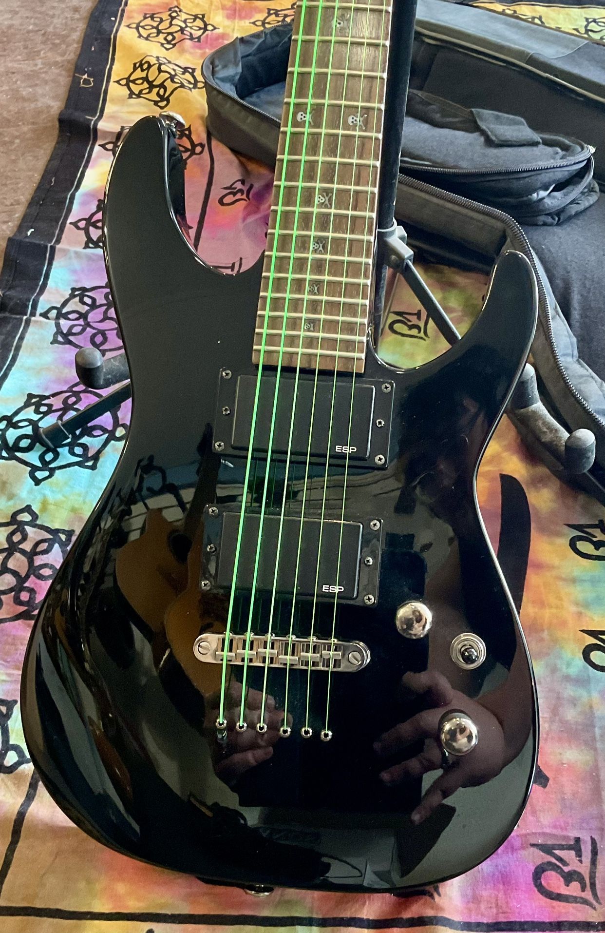 The ESP LTD KH-JR Kirk Hammett Junior Electric Guitar w/ Gig Bag This is a fantastic junior sized issue of legendary Metallica guitarists Kirk Hammett’s KH models. Incorporating premium quality components and materials such as the Basswood body with painted Maple neck, 22 fret Rosewood fingerboard with skull and crossbones inlays and powerful ESP LH-301 humbucking pickups the KH-JR is perfect for junior Metallica fans or even as a high quality travel guitar. Features/SpecificationsBody & Bridge Body: Basswood Size: 3/4 Construction: Bolt-On Finish: Black Bridge: Tune-O-Matic with String-Thru Neck & Fingerboard Neck: Maple Neck Profile: Extra Thin Flat Fretboard: Rosewood Fretboard Radius: 350mm Frets: 22 Extra Jumbo Inlays: Skull and Crossbones Scale Length: 20.5" Nut: Graphite Nut Width: 42mm Hardware & Electronics Controls: 1 x Volume, 1 x Tone, 3-Way Toggle Switch Bridge Pickup: ESP Designed LH-301B (Humbucker/Passive) Neck Pickup: ESP Designed LH-301N (Humbucker/Passive) Tuners: LTD Hardware: Black Nickel Shipping available ccEJB