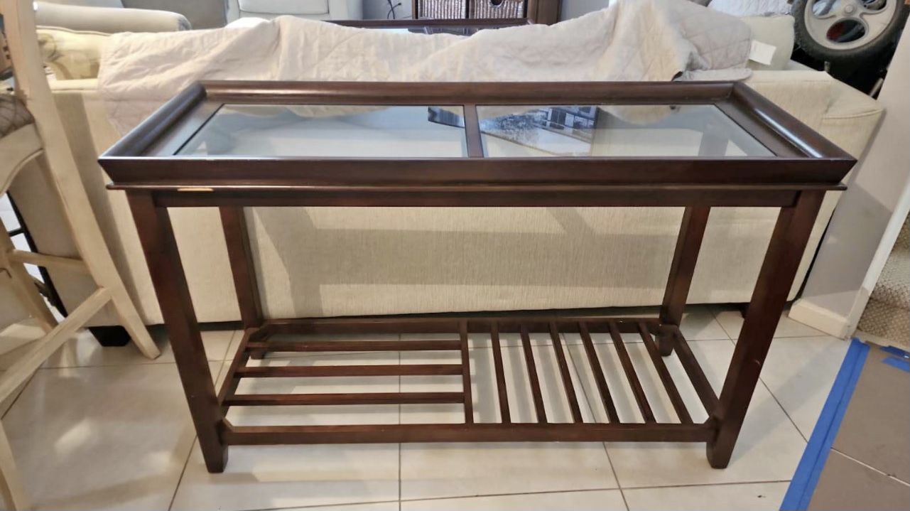 This is an excellent glass & solid wood dining console and entryway table. 48"L 30" H 18" W