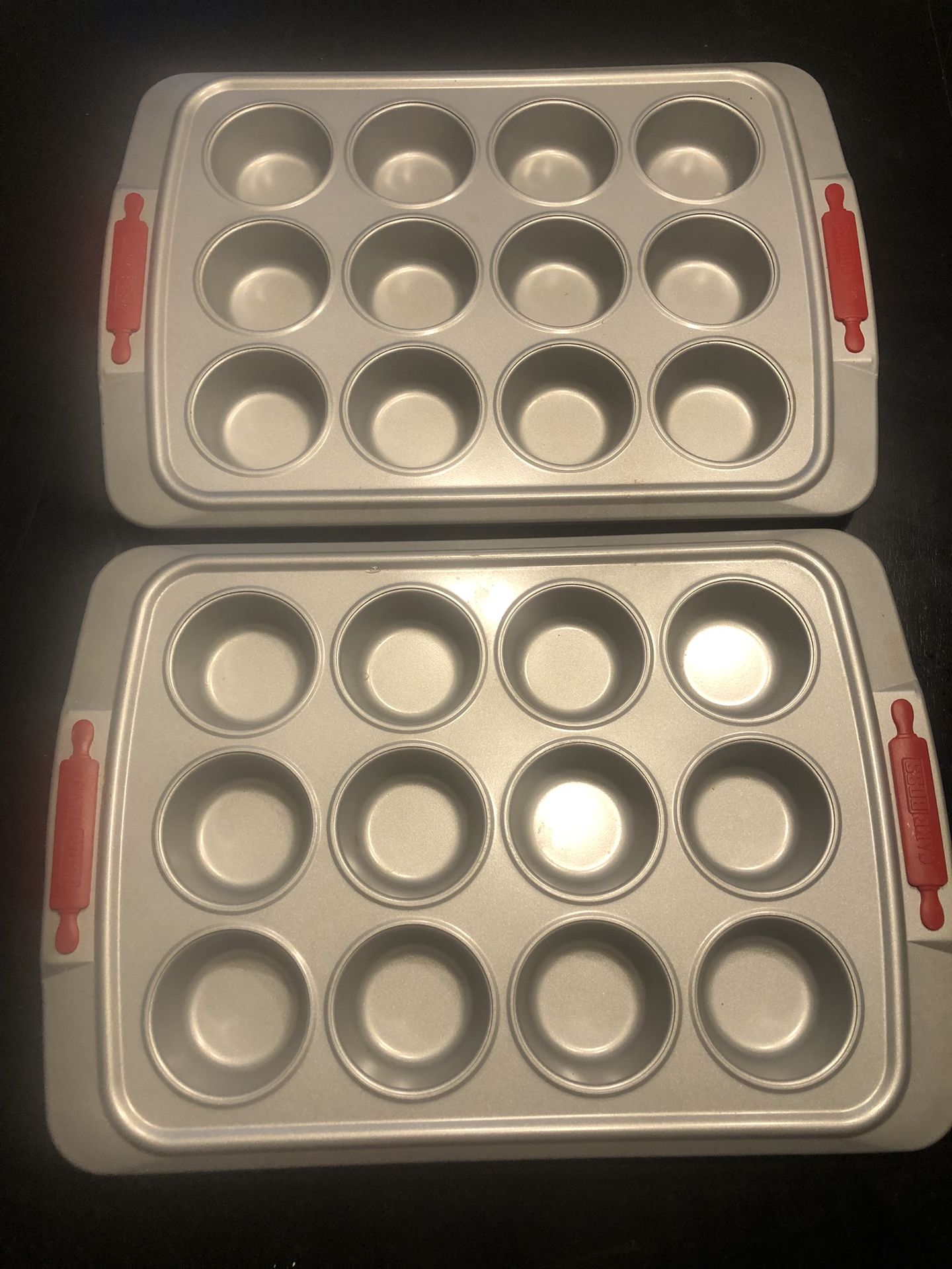 These were probably used once or twice. These are clean and in great shape . No stains. Bakewares are not bent and it appears to made out of aluminum or metal . This seller does not know which or its material and they are safe for baking in the oven. They are heavy and sturdy.