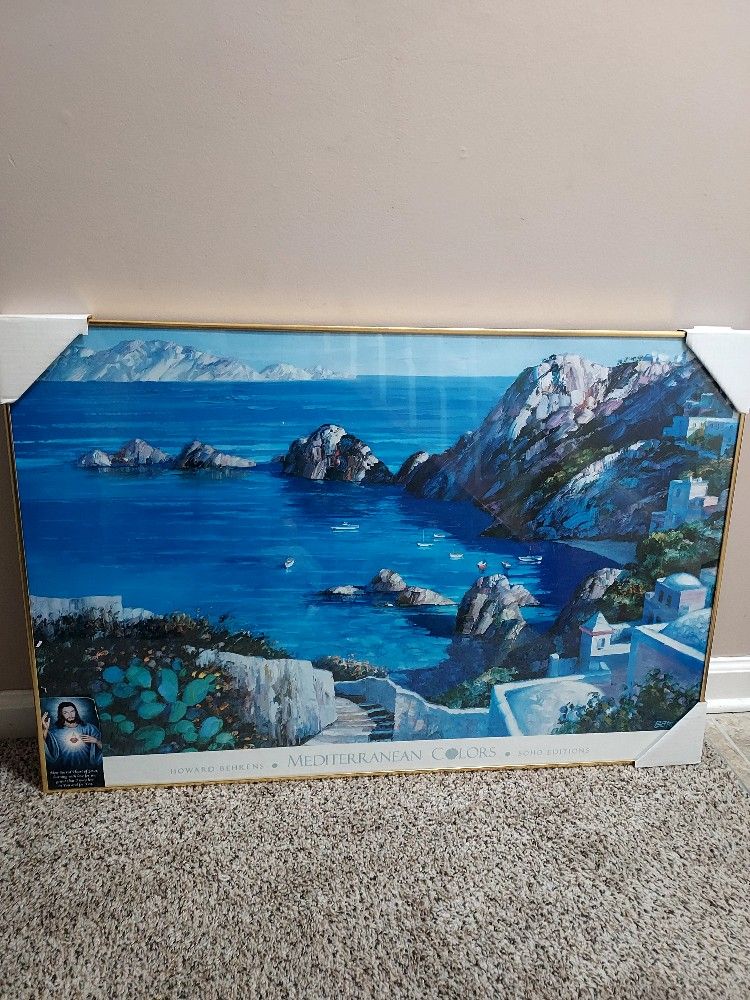 Description: Artist: Howard Behrens (American, 1(contact info removed)), a renowned palette knife artist known for his vibrant, expressionist landscapes and seascapes. Artwork: "Mediterranean Colors," a beautiful, vivid print capturing a serene coastal view with bright blue water and white buildings. Medium: Art print, likely a Soho Edition as indicated on the image text. Howard Behrens was known for his limited edition serigraphs and giclees. Condition: Excellent, professionally custom framed in a gold-tone frame, ready to hang. Approximate Dimensions: The exterior dimensions of the frame are approximately 16-5/8" x 21-5/8", and the print itself is about 14" x 19". About the Artist: Behrens was celebrated as one of the foremost contemporary palette knife artists, with a passion for traveling to locations like the Amalfi Coast and Italy to capture their beauty. His work has been featured in numerous art publications and shows. Open to reasonable offers. Pickup: Available for local pickup in Charles Town, WV 25414.