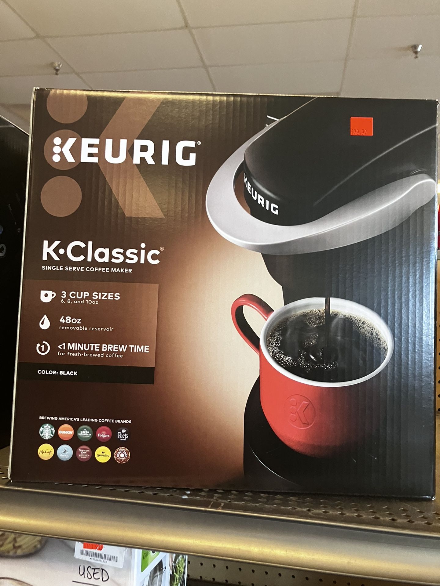 Keurig K classic single serve K cup pod coffee maker. Brew your perfect cup with a Keurig K cup. Engineered for simplicity and consistency. The single serve coffee maker delivers three customizable brew sizes 6 ounce 8 ounce 10 ounce allowing you to match your caffeine need precisely the 48 ounce water reservoir, minimizes refilling while auto shut off feature after two hours ensure energy efficiency compatible with thousands of K cup pods. This item is located at Prescott Valley Liquidators in Prescott Valley Arizona. This item is new in original packaging retails for $119