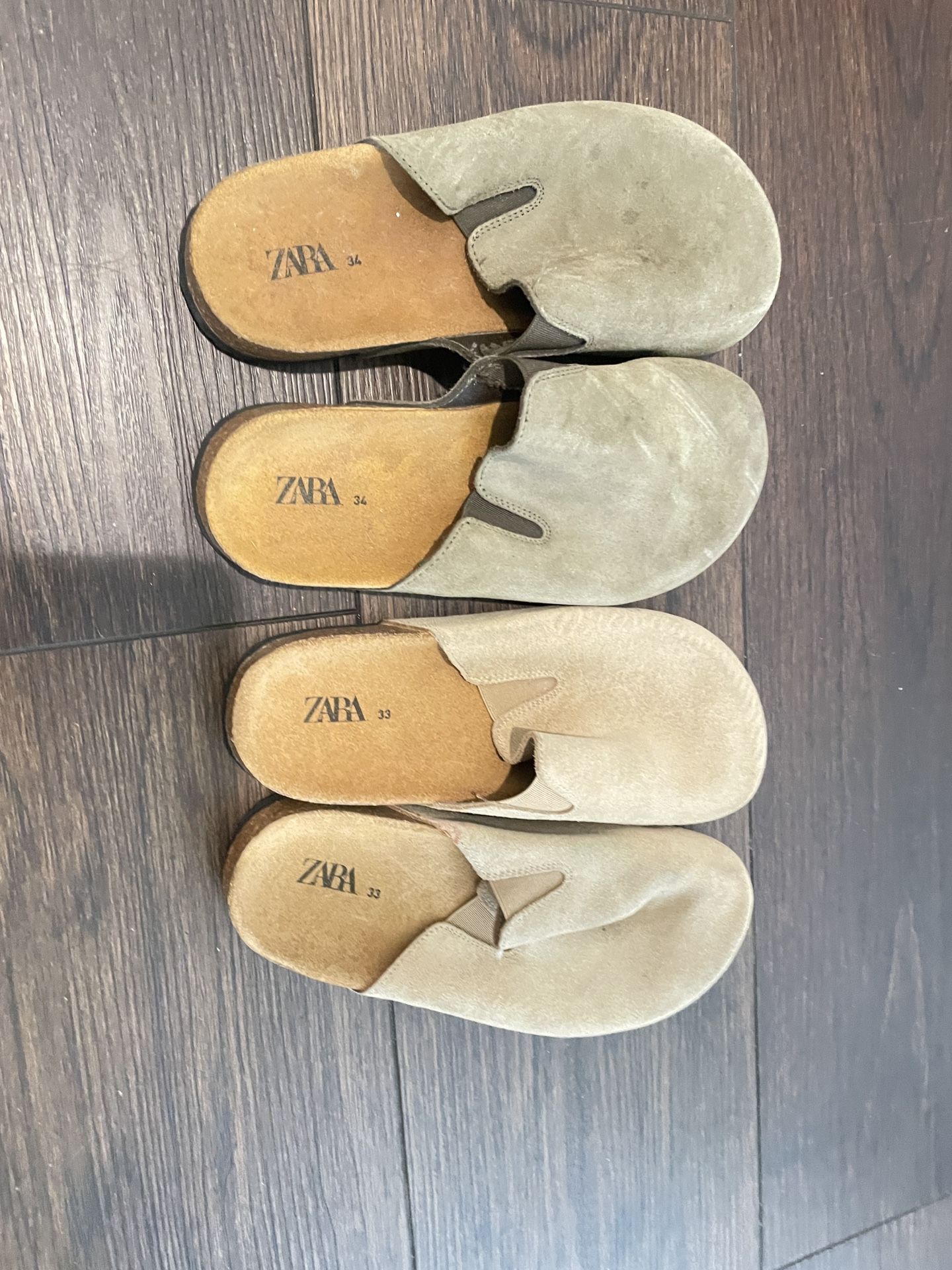 Green suede, gently used; size 34. Light tan, never used (dusty from storing); size 33.