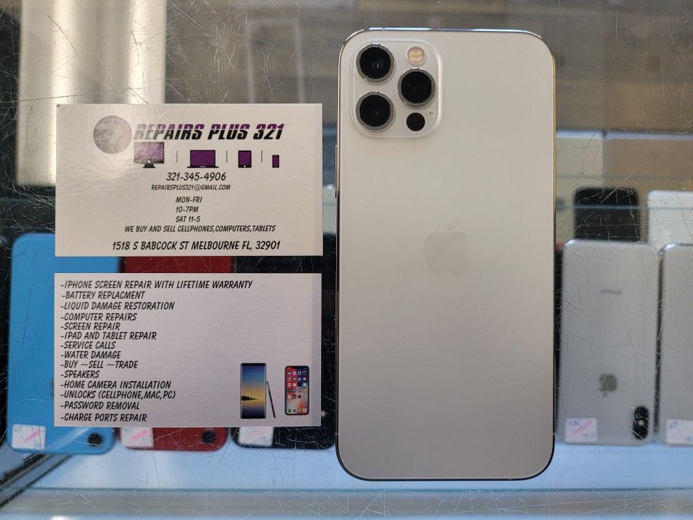 We have an unlocked Silver iPhone 12 Pro 128gb for sale! It comes with a 60 Day Warranty! Charger included! We offer financing and we even give you a chance to extend the warranty to one year! Come Visit Repairs Plus 321! We have many other iPhones, Samsung, Macbooks, and Apple Watches for sale!